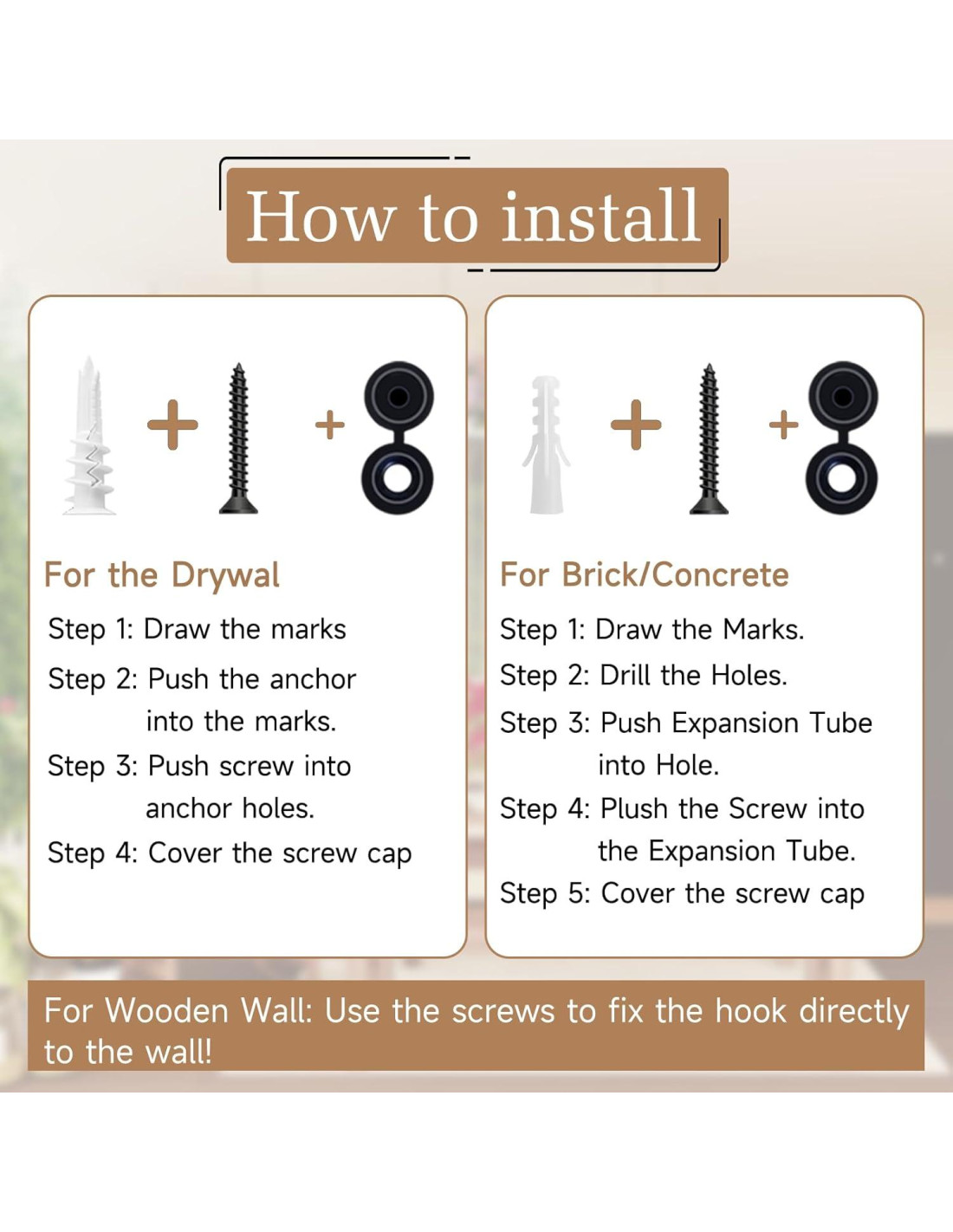 - Lo que Obtienes: Cada paquete de 2 Ganchos para Jardineras con 4 Tornillos de Montaje - Aproximadamente: 2 pulgadas (50 mm), 4 Anclajes de Pared de Montaje - Aproximadamente: 1.58 pulgadas (40 mm), 4 Tubos de Expansión de Montaje - Aproximadamente: 1.18 pulgadas (30 mm) y 4 Tapas de Cubierta de Tornillo de Montaje.