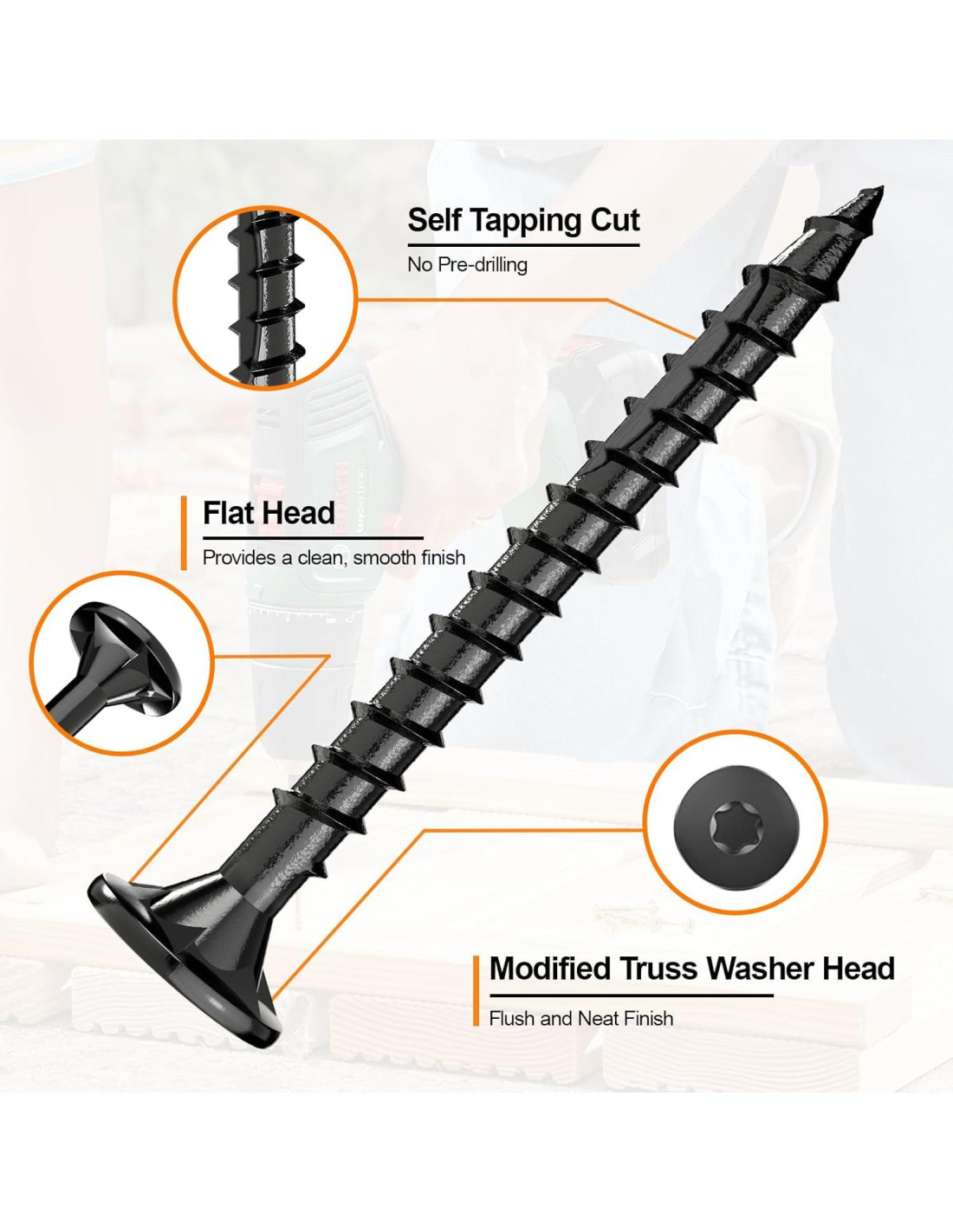 - Instalación Sin Esfuerzo: Diseñados con una configuración de cabeza estrella para un máximo par y un mínimo deslizamiento, estos tornillos ofrecen una fácil instalación con una punta autoperforante afilada, perfecta para un ensamblaje eficiente en decking y otras superficies de madera.