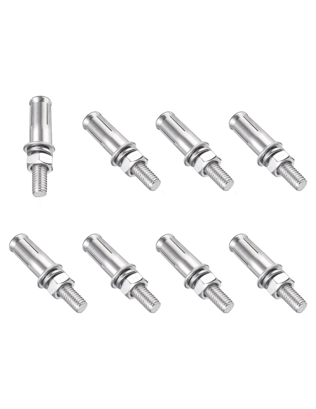 - Especificación: Color: Plata; Material: Acero Inoxidable 304; Tamaño de Rosca: M8 x 50mm; Tamaño Total: 50 x 16mm (1.97 x 0.63 pulgadas); Tamaño del Manguito: 30mm (1.18 pulgadas); Diámetro del Taladro: 12mm (0.47 pulgadas); Lista de Empaque: 8Pcs x Tornillos de Expansión