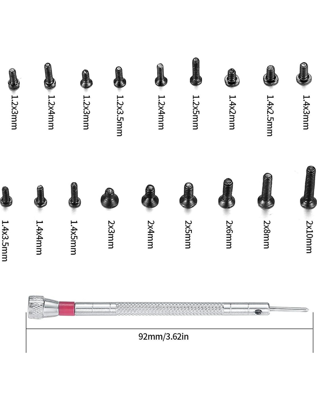 Información del Producto - Nombre del Producto: Kit de Surtido de Tornillos Micro - Material: Acero al carbono - Color: Negro - Cantidad: aproximadamente 500 Pcs El Paquete Incluye: 27 * Cabeza redonda M1.2*3.0 mm 27 * Cabeza redonda M1.2*4.0 mm 27 * Cabeza avellanada M1.2*3.0 mm 27 * Cabeza avellanada M1.2*3.5 mm 27 * Cabeza avellanada M1.2*4.0 mm 27 * Cabeza avellanada M1.2*5.0 mm 27 * Cabeza avellanada M2.0*3.0 mm 27 * Cabeza avellanada M2.0*4.0 mm 27 * Cabeza avellanada M2.0*5.0 mm 27 * Cabeza avellanada M2.0*6.0 mm 27 * Cabeza avellanada M2.0*8.0 mm 27 * Cabeza avellanada M2.0*10 mm 27 * Cabeza plana M1.4*2.0 mm 27 * Cabeza plana M1.4*2.5 mm 27 * Cabeza plana M1.4*3.0 mm 27 * Cabeza plana M1.4*3.5 mm 27 * Cabeza plana M1.4*4.0 mm 27 * Cabeza plana M1.4*5.0 mm 1 * Destornillador Mini Multifuncional 1 * Caja de Clasificación Características: - Nuestros tornillos de reparación de relojes micro están hechos de acero al carbono de alta calidad, que tiene alta dureza, resistencia al desgaste, robusto y duradero. - Estos tornillos pequeños para gafas están todos empaquetados en una caja de almacenamiento, que es fácil de llevar y fácil de encontrar. - Nuestro kit de tornillos negros para laptops está equipado con un destornillador, que es conveniente para su uso diario. - Obtendrá casi 500 pcs de tornillos de reparación negros en 18 tamaños, suficientes para su uso diario. - Estos tornillos de máquina se pueden usar para varios componentes electrónicos, como laptops, teléfonos móviles, placas electrónicas, varios tipos de herramientas, juguetes, etc. Consejos Útiles - Este producto contiene piezas pequeñas, por favor no deje que los niños jueguen con él para evitar la ingestión accidental. - Si tiene alguna pregunta al usar nuestros tornillos pequeños, no dude en contactarnos, resolveremos sus preguntas lo antes posible.