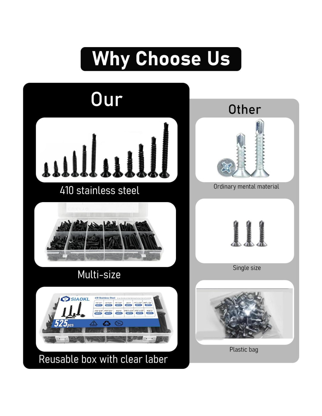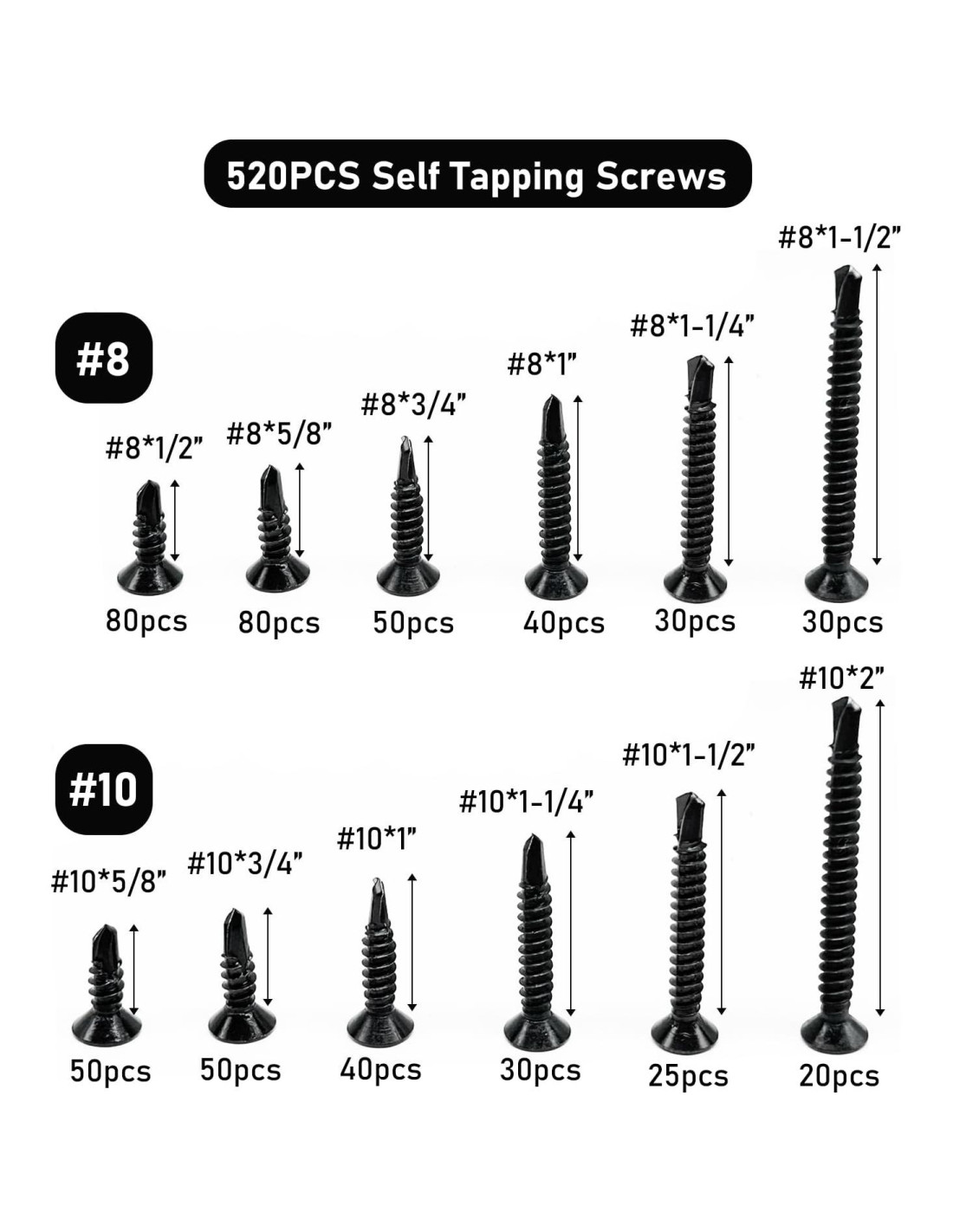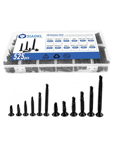 - [Gran cantidad de 520PCS] -- El kit de tornillos autorroscantes SIAOKL incluye 520 tornillos de diferentes tamaños, 80 piezas de #8 x 1/2" (1.27 cm), 80 piezas de #8 x 5/8" (1.59 cm), 50 piezas de #8 x 3/4" (1.91 cm), 40 piezas de #8 x 1" (2.54 cm), 30 piezas de #8 x 1-1/4" (3.18 cm), 30 piezas de #8 x 1-1/2" (3.81 cm), 50 piezas de #10 x 5/8" (1.59 cm), 50 piezas de #10 x 3/4" (1.91 cm), 40 piezas de #10 x 1" (2.54 cm), 30 piezas de #10 x 1-1/4" (3.18 cm), 25 piezas de #10 x 1-1/4" (3.18 cm), 20 piezas de #10 x 2" (5.08 cm).