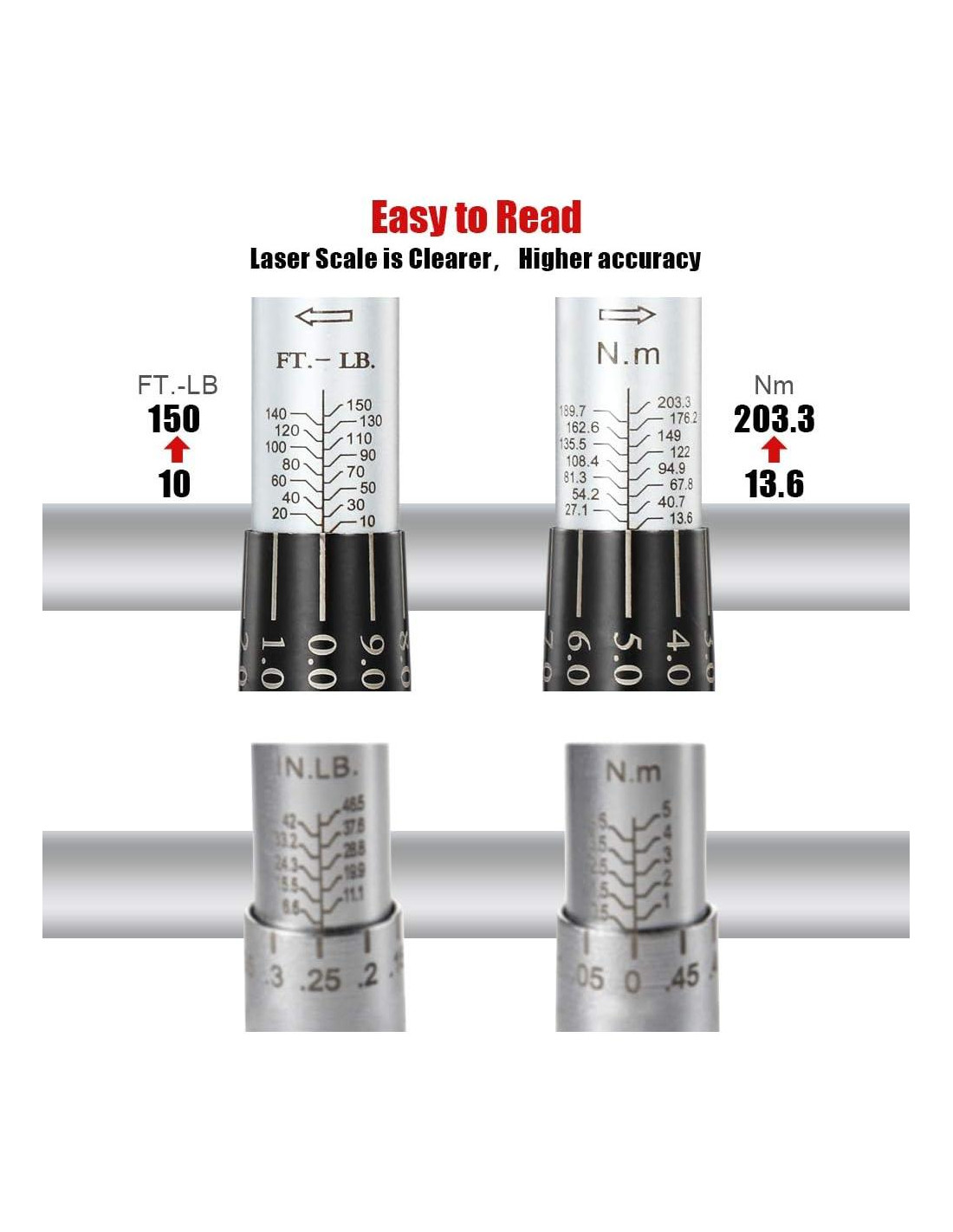 - CONFIABLE Y SEGURO: Cuando se alcanza el valor de torque establecido, la llave emitirá un sonido de clic para recordarle que deje de aplicar fuerza para evitar daños por sobre-torque a sus artículos. La escala adopta tecnología láser, la escala de doble rango es clara y fácil de leer, no es fácil de desgastar.