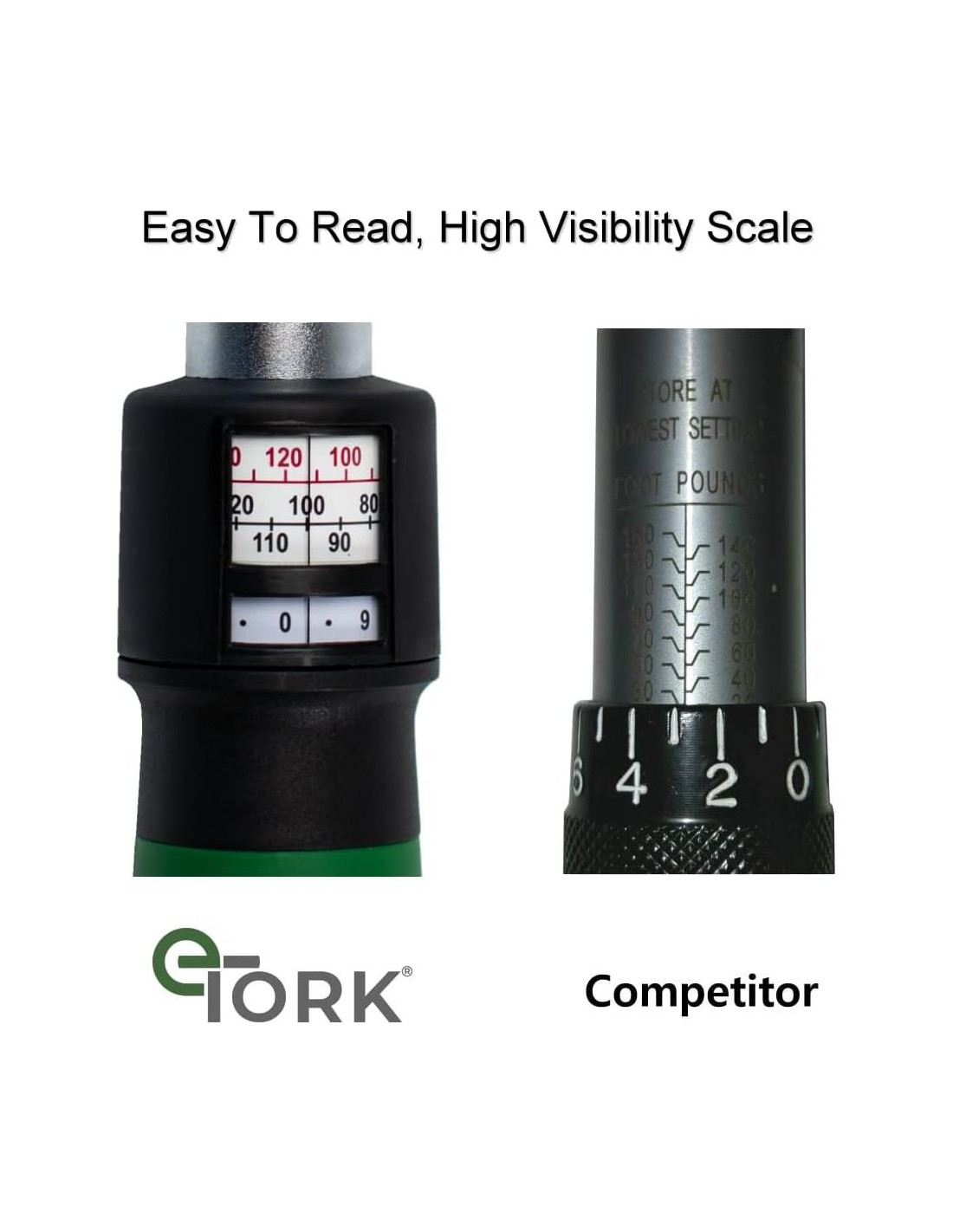 - DISEÑO DE ESCALA FÁCIL DE LEER: La llave de torque eTORK cuenta con una ventana de visualización diseñada de manera única que facilita la lectura de los ajustes de torque en comparación con las llaves de carraca estándar. Este juego de herramientas mecánicas es esencial y ofrece una visibilidad y precisión superiores tanto para mecánicos profesionales como para entusiastas del bricolaje que trabajan en aplicaciones de herramientas automotrices, eliminando la conjetura al establecer especificaciones de torque exactas.