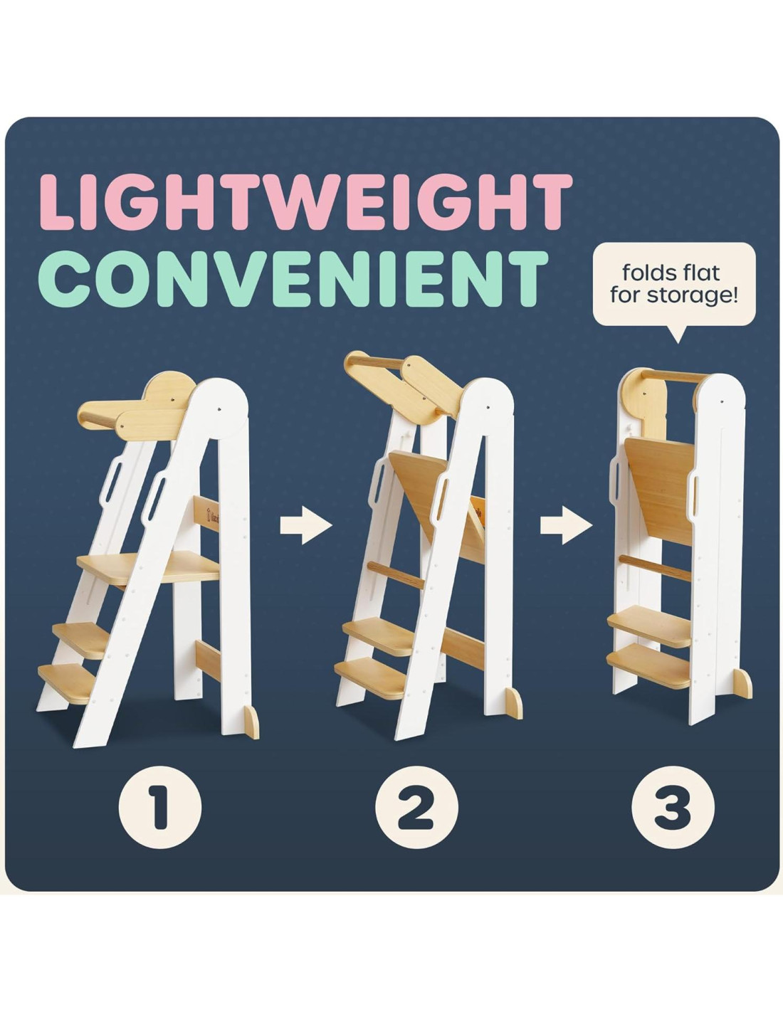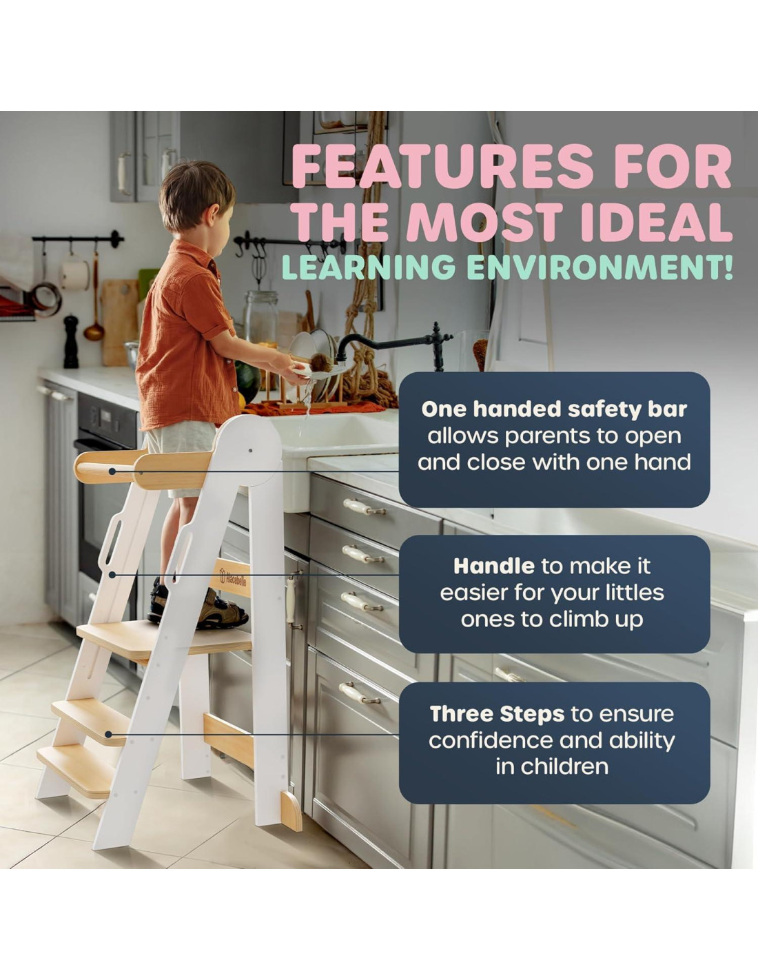 - MANTENGA A SU HIJO SEGURO mientras se cepilla los dientes, se lava las manos o ayuda en la cocina, gracias a los rieles de seguridad y la manija de nuestra torre de silla plegable. No más preocupaciones por resbalones, ya que la función anti-vuelco mantiene esta torre de ayuda para niños estable en cualquier superficie.