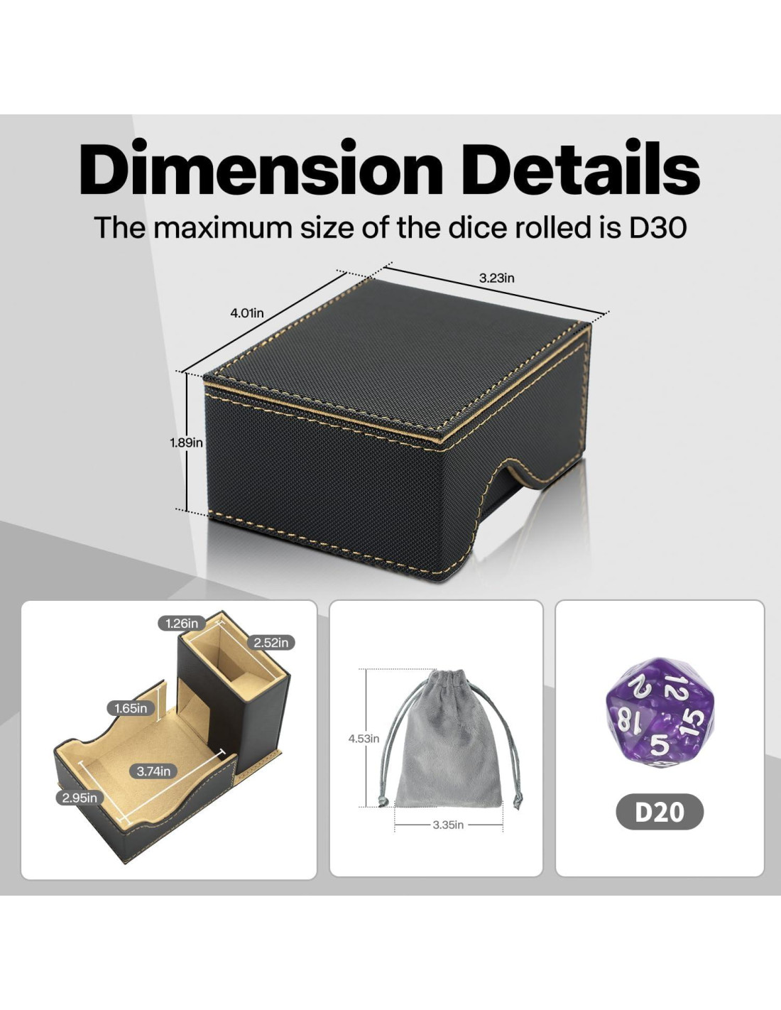 - 3-en-1 Caja de Dados Plegable Este accesorio de juego portátil combina funciones de almacenamiento, bandeja de lanzamiento y torre de dados. Su diseño magnético incorporado lo mantiene cerrado de forma segura durante el transporte. Se convierte fácilmente entre un estuche delgado y una configuración completa.