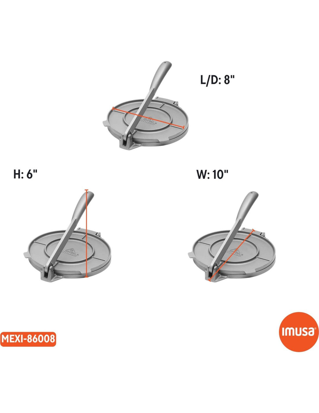 La prensa de tortilla de aluminio IMUSA es un best seller en los EE. UU. El diseño tradicional y duradero permite hacer tortillas caseras perfectamente prensadas, con el grosor y la forma redonda justos. La prensa de tortilla es una herramienta esencial en cualquier cocina mexicana. Las tortillas se han utilizado durante muchos siglos, particularmente en México y más recientemente en los Estados Unidos. La tortilla se consume durante todo el año, y se prepara comúnmente con carne para hacer platillos como tacos, burritos y enchiladas. Fácil de usar: solo inserta tu masa y con una presión, una tortilla fresca. ¡Impresiona a tus invitados con tortillas caseras en tu próxima cena temática mexicana!