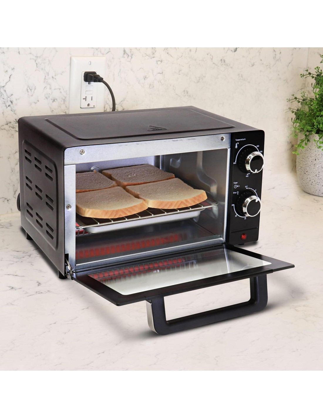 El Horno Tostador Total Chef de 4 Rebanadas ofrece cocina multipropósito en un diseño compacto de mostrador, perfecto para cocinas pequeñas, apartamentos y dormitorios. Tuesta pan, hornea galletas, asa alitas de pollo y más en esta unidad de 1000 vatios con temporizador y perillas de control de temperatura fáciles de usar. Esta unidad viene con una bandeja de hornear aluminizada, una rejilla de alambre cromada y una bandeja para migas que son removibles para una fácil limpieza. Este conveniente horno tostador cuenta con un amplio rango de temperatura de 200-450F (93-232C) para satisfacer todas tus necesidades de cocina. El temporizador de 30 minutos con apagado automático permite un tostado preciso y controlado; o usa la función de Mantener Encendido para tiempos de cocción más largos. Los elementos de calefacción superiores e inferiores se encienden y apagan durante el proceso de cocción para mantener una temperatura constante. ¡Este pequeño electrodoméstico se convertirá rápidamente en uno de tus favoritos! Cocina multipropósito en un diseño compacto de mostrador, ¡perfecto para cocinas pequeñas, apartamentos y dormitorios! Tuesta pan, hornea galletas, asa alitas de pollo y más sin calentar toda tu cocina.