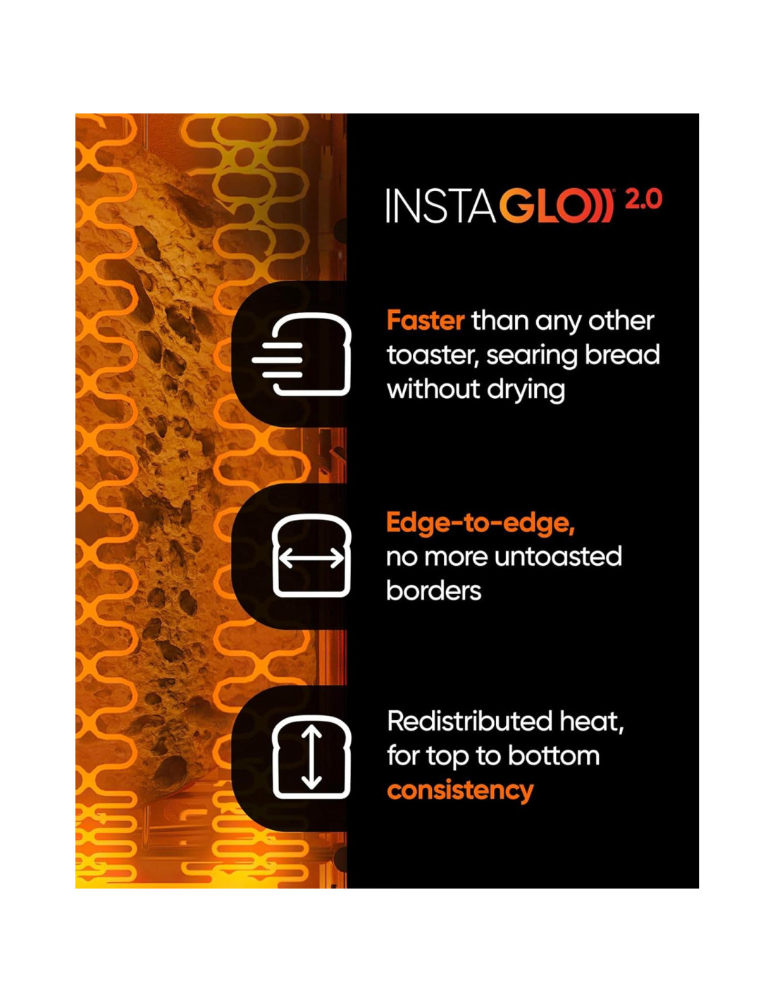 - Tostado más rápido y más inteligente - La tecnología patentada InstaGLO 2.0 se calienta en segundos y retiene la humedad para ofrecer resultados crujientes y dorados cada vez. Algoritmos preprogramados reconocen 38 tipos de pan y ajustan automáticamente el tiempo y la temperatura para un resultado perfecto y confiable.