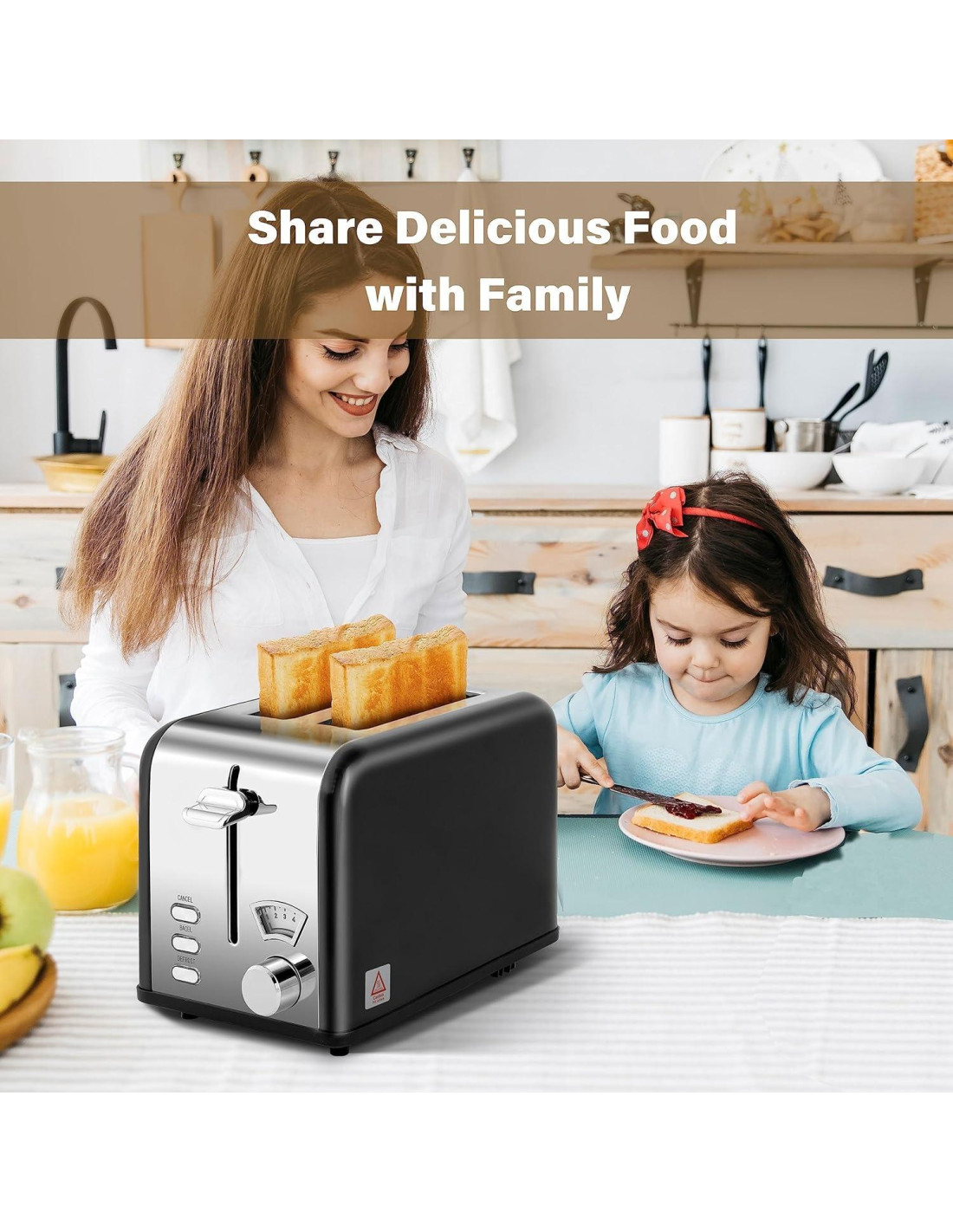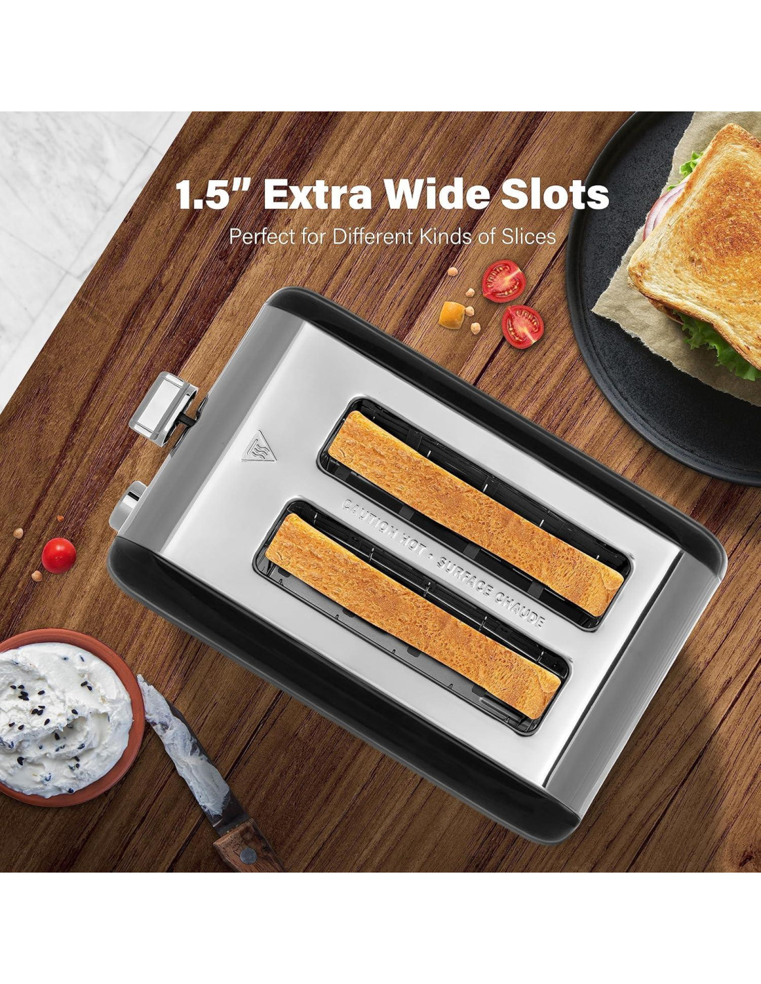 - Ranura de 1.5 pulgadas (3.81 cm) de ancho: La tostadora cuenta con una ranura de 1.5 pulgadas (3.81 cm) de ancho, que puede tostar diferentes tipos de pan, como waffles o pan artesanal grueso. Usando tecnología de calentamiento envolvente, hace que el calentamiento del pan sea uniforme, evitando efectivamente la desigualdad en el horneado