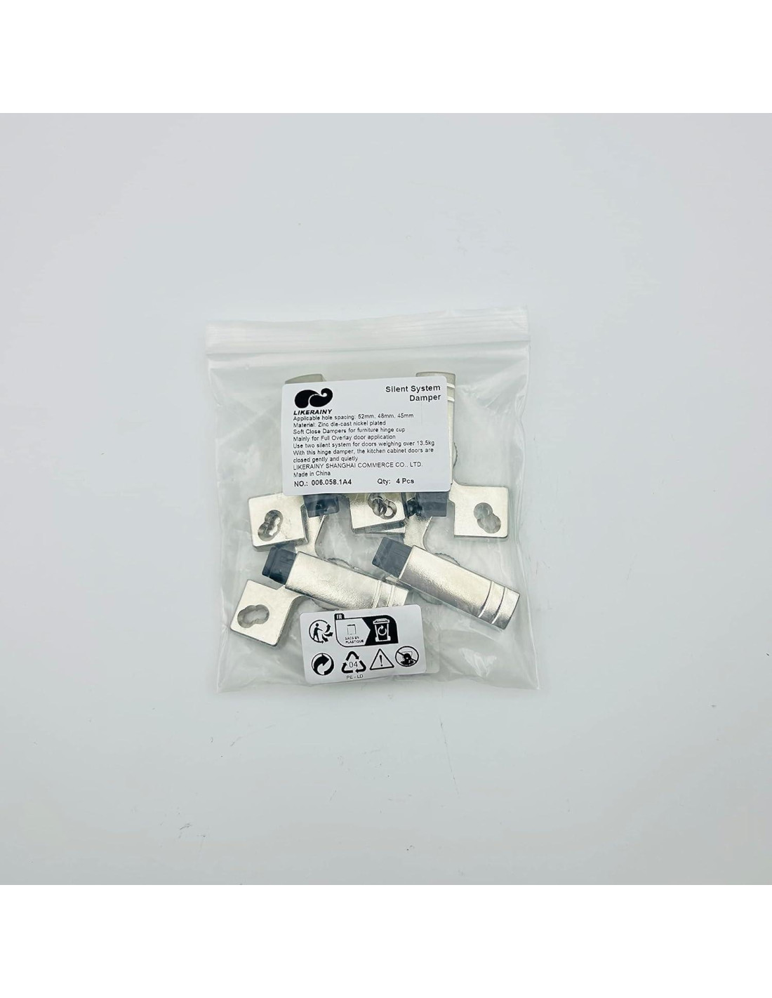 LIKERAINY Advertencia: Por favor, determine el tipo de aplicación de su bisagra (Superposición Total, Superposición Media y Empotrada) antes de comprar, lo cual es muy importante. Detalles del Producto -Tipo de artículo: 60581A4 Bisagra de Sistema Silencioso, Superposición Total -Material: Aleación de Zinc fundido -Opción de montaje de puerta: Aplicación de Superposición Total -Acabado: Niquelado -Distancia entre los dos agujeros para tornillos: 52mm (2.05 pulgadas) / 48mm (1.89 pulgadas) / 45mm (1.77 pulgadas) -Opción de montaje: para atornillar en Paquete Estándar -Amortiguadores de Bisagra: 4 Piezas - Sin Instrucciones de Montaje ni Información de Procesamiento (Ver Imágenes Arriba) Nota -Estos amortiguadores de cierre suave son esenciales cuando está construyendo gabinetes o reemplazando los que tiene. Son bastante fáciles de instalar y mantienen las puertas suavemente y en silencio.
