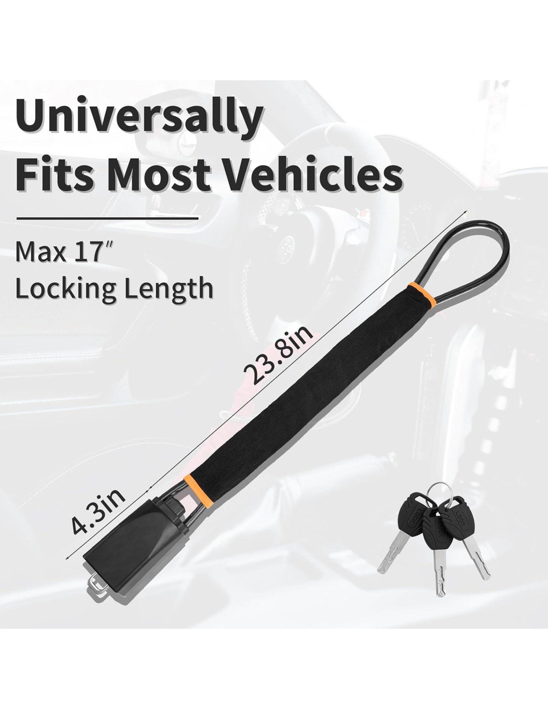 - Ajuste Universal: Compatible con la mayoría de los vehículos, el dispositivo antirrobo de bloqueo de volante se extiende hasta 43 cm (17 pulgadas) para conectar de manera segura el volante y el asiento. Para un bloqueo óptimo, se recomienda ajustar la posición del asiento para asegurar un ajuste ceñido.