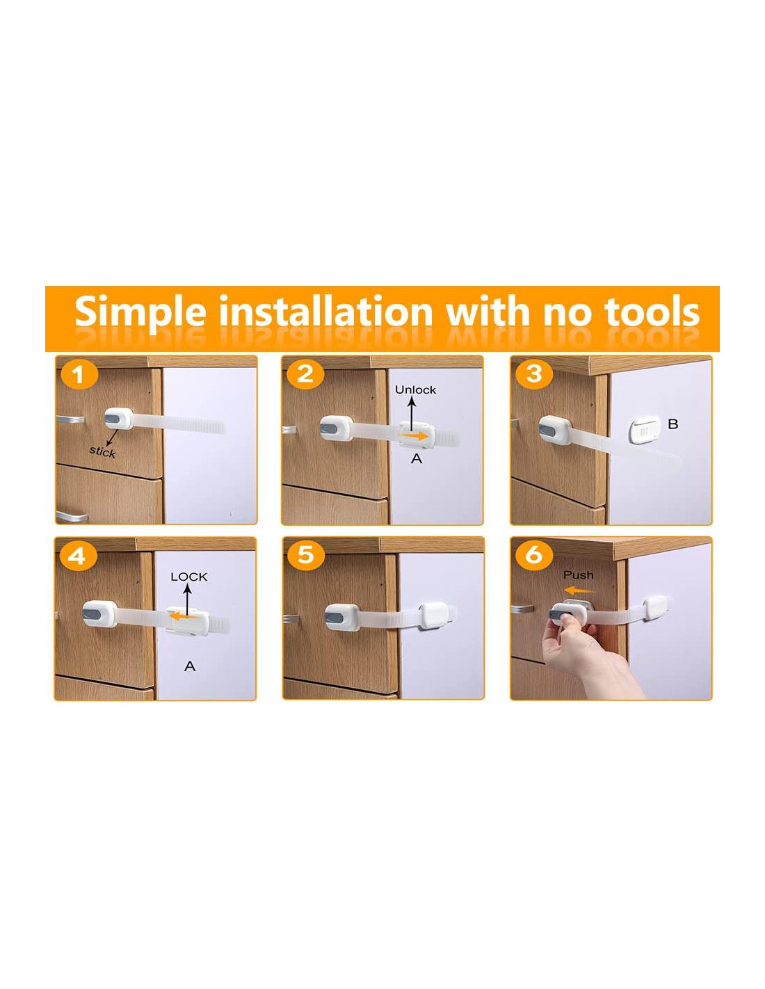 - CERRADURAS DE SEGURIDAD MULTIUSO: No debería ser difícil vivir en un hogar seguro. Nuestras correas de bloqueo convenientes y fáciles de usar son compatibles con todo tipo de alacenas, cajones, inodoros y refrigeradores. Funcionan tan bien que puedes usarlas en tu cocina, baño, lavandería y más.