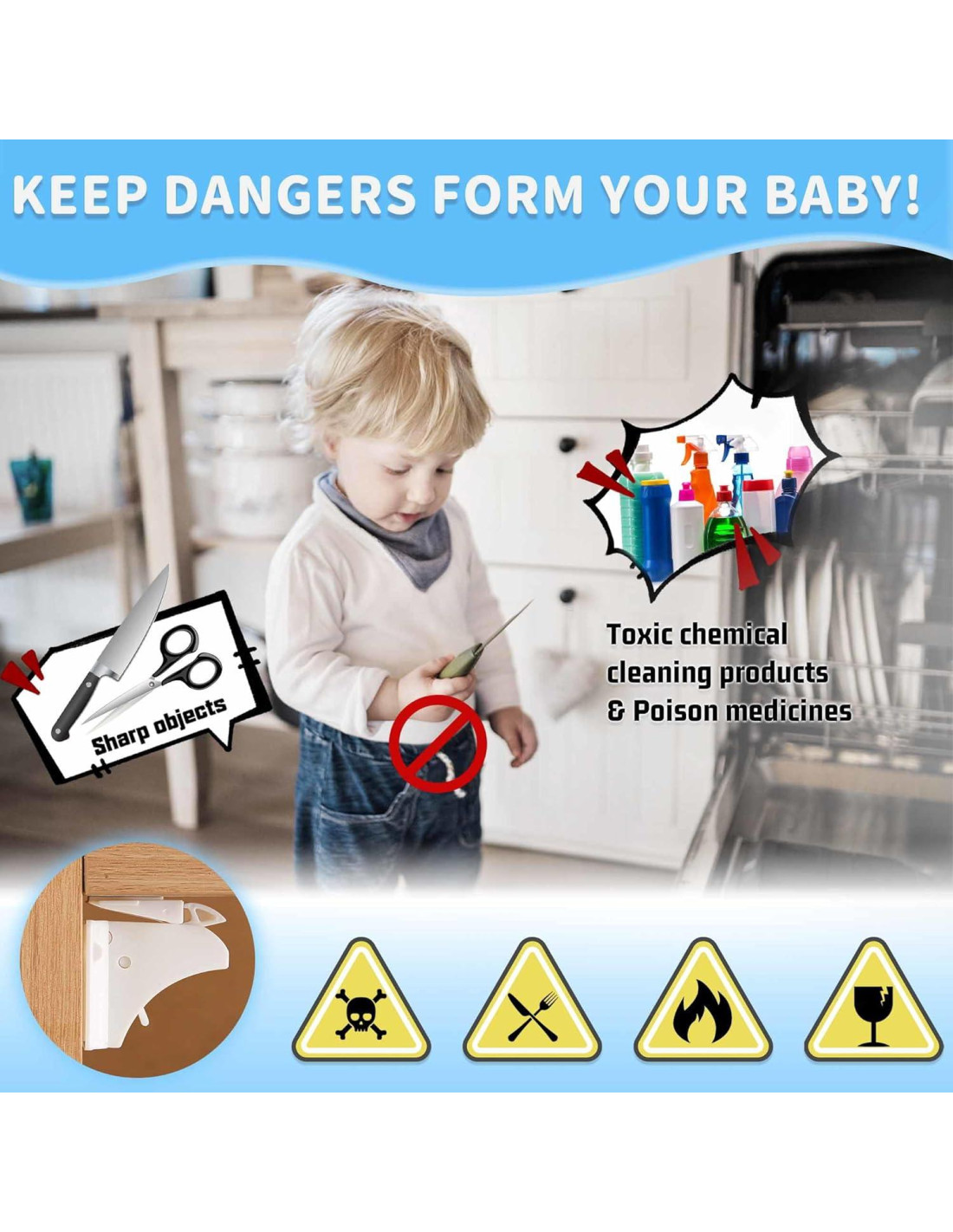 - DURADERO COMO QUIERA Y FÁCIL DE QUITAR - Con un adhesivo de marca ultra fuerte, las cerraduras de seguridad para bebés son duraderas durante meses e incluso años como desee. Aunque no son fáciles de caer, son fáciles de quitar con un secador de pelo o alcohol y definitivamente no dejan rastro. Así que no tiene que preocuparse por que se caiga o destruya los muebles.