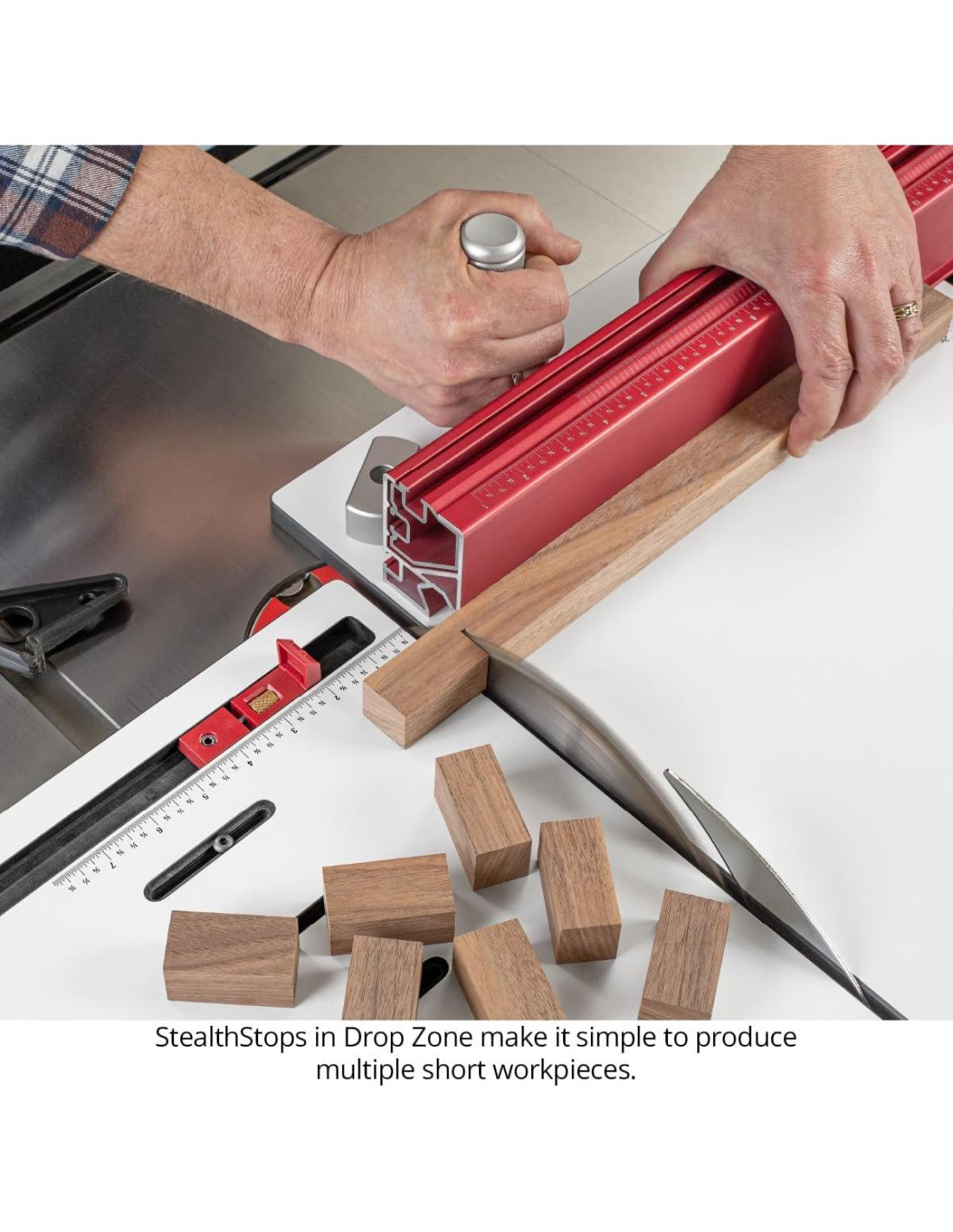 - GRAN PARA MÚLTIPLES CORTES CORTOS - Las paradas Stealth en la Zona de Caída hacen que sea simple producir múltiples piezas de trabajo cortas rápidamente y con precisión.
