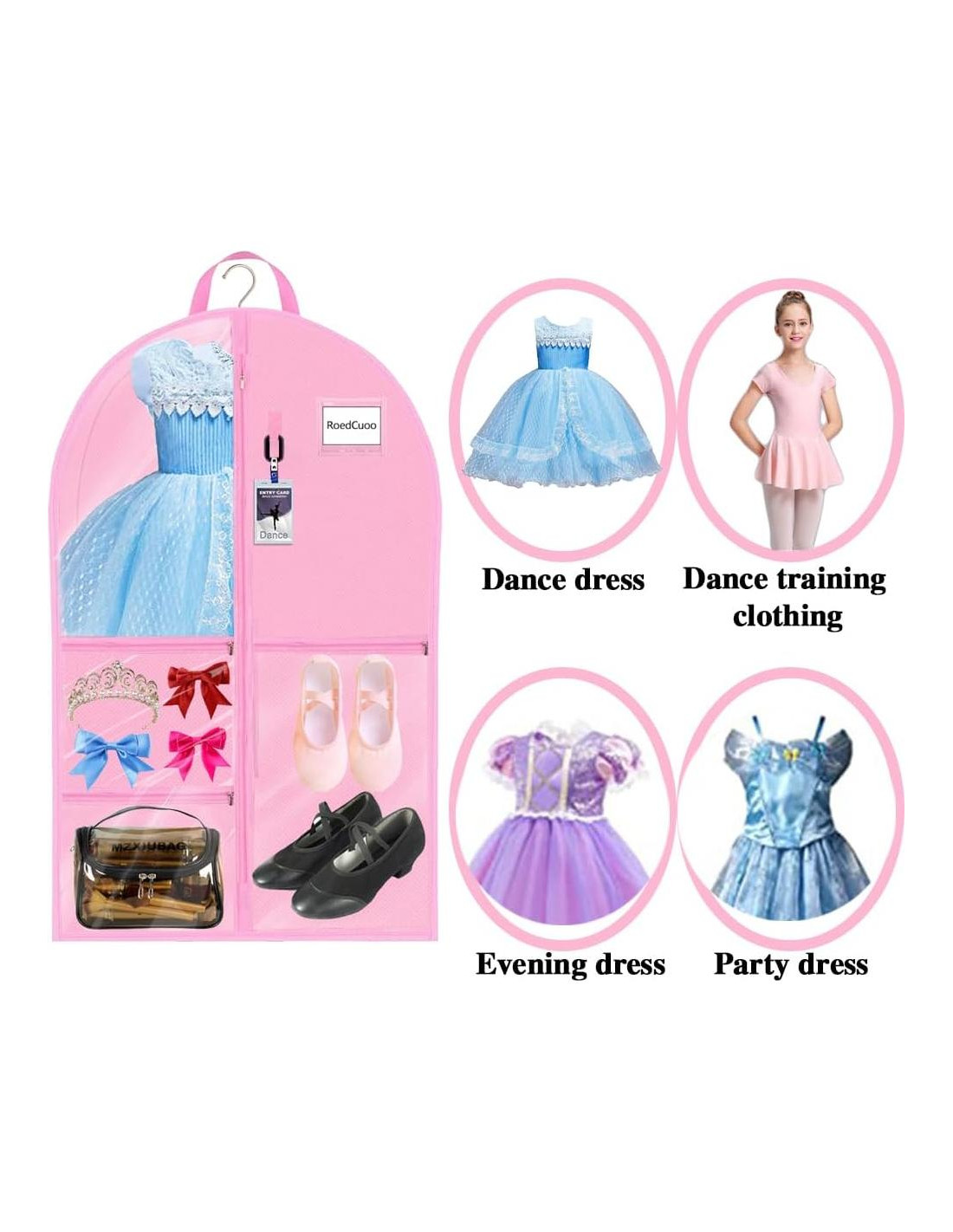 - Bolsa Multifuncional para Bailarinas con Cremallera Más Fuerte: Los bolsillos con cremallera del almacenamiento de disfraces para niñas mantienen todos los accesorios visibles y organizados. Las bolsas de vestuario son excelentes para zapatos de danza, piezas de cabello, joyas, calcetines, etc., para que no olvides nada; el bolsillo para etiqueta de nombre también está cosido en la bolsa, así que no te preocupes por mezclar los vestidos durante la actuación grupal.