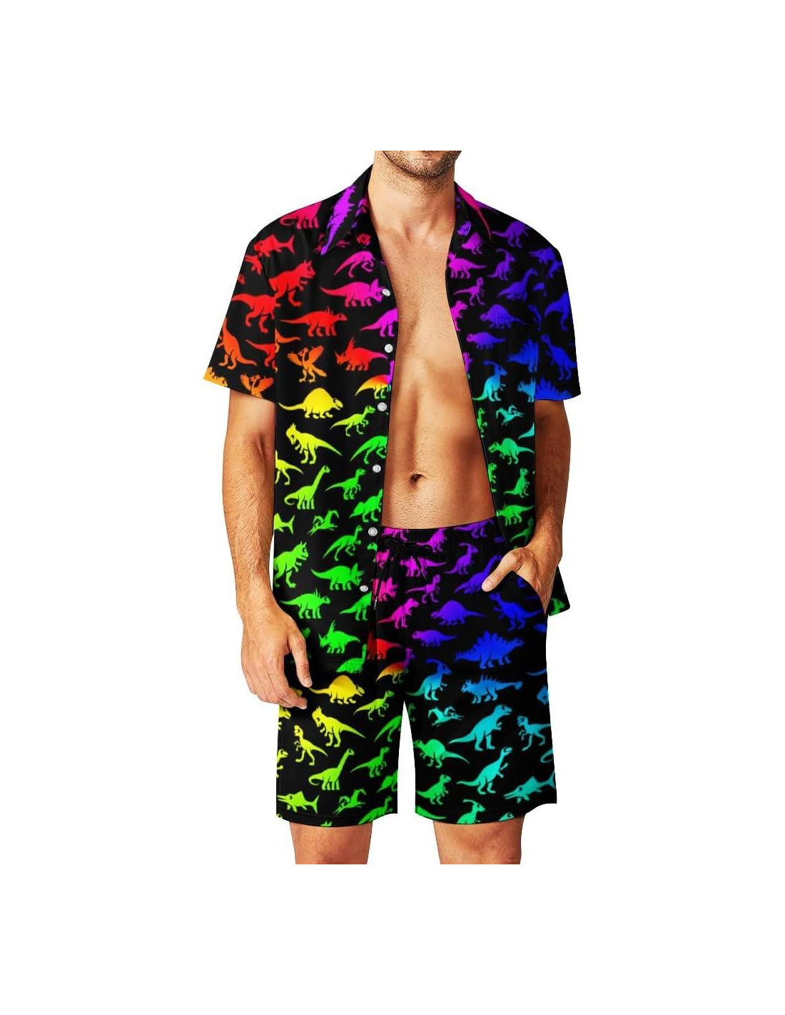 - Camisas hawaianas divertidas para hombres La camisa y los pantalones cortos están hechos de una tela suave y cómoda, que es ligera, suave y transpirable, con un ajuste holgado para mantenerte fresco y relajado. Camisa con cuello cubano, cierre de botones y bolsillo en el pecho izquierdo. Pantalones cortos de tela de secado rápido, cordón ajustable y elástico en la cintura.