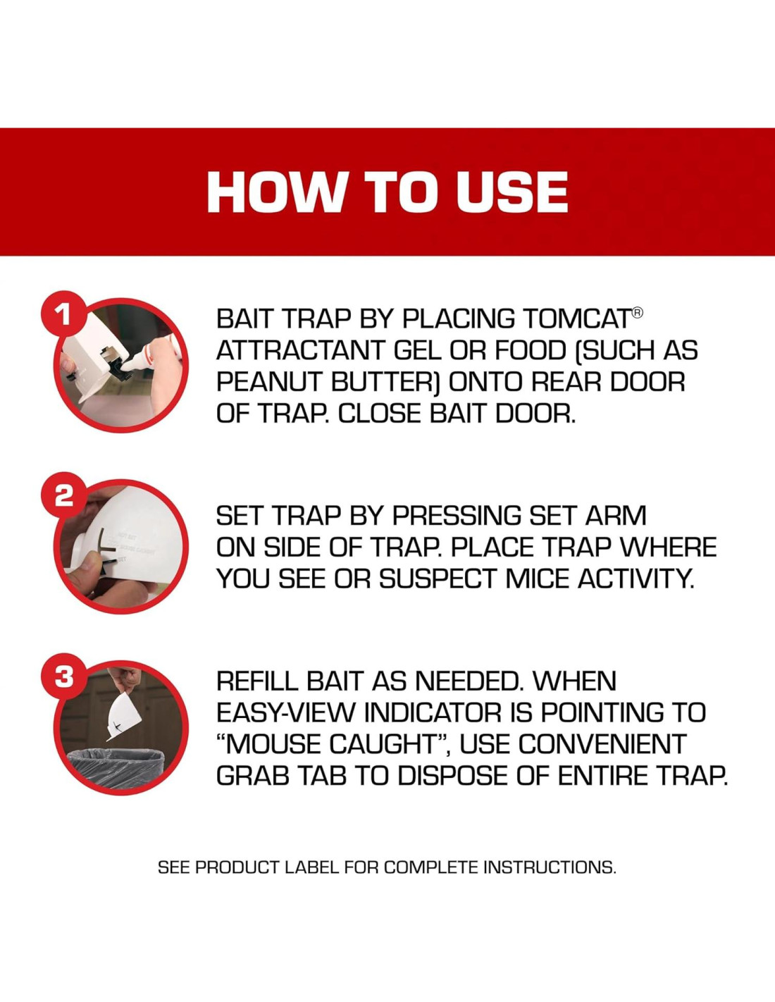 Proteger su hogar y familia de los ratones ahora es más fácil con la trampa para ratones Tomcat Kill & Contain. El diseño cubierto de esta trampa mata y contiene al ratón, por lo que nunca tendrá que ver o tocar un ratón muerto de nuevo. Leyó bien: no tiene que ver al ratón para saber que ha sido atrapado. Además, la trampa es ideal para espacios reducidos y se coloca con solo un toque. Para usar, abra la puerta de cebo ubicada en la parte posterior de la trampa y coloque el Gel Atractivo Tomcat (se vende por separado) u otro alimento como mantequilla de maní o queso en el pozo de cebo. Luego, cierre la puerta de cebo y coloque la trampa presionando el brazo en el lado de la trampa. Recomendamos colocar dos trampas Tomcat Kill & Contain a 1.5 a 3 metros de distancia en áreas donde se ha notado o sospechado actividad de ratones, como cerca de refrigeradores, estufas y despensas, entre lavadoras y secadoras, y a lo largo de los zócalos. Revise las trampas con frecuencia. Cuando el indicador apunta a "Ratón Atrapado", el ratón ha sido capturado. Simplemente use la pestaña de agarre para desechar toda la trampa. Este paquete de trampa para ratones Tomcat Kill & Contain contiene 2 trampas desechables.