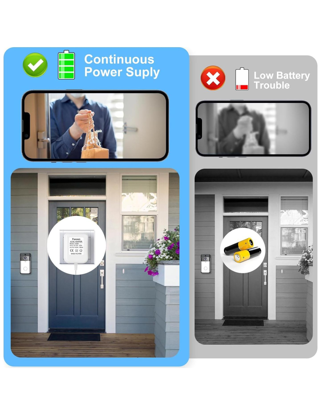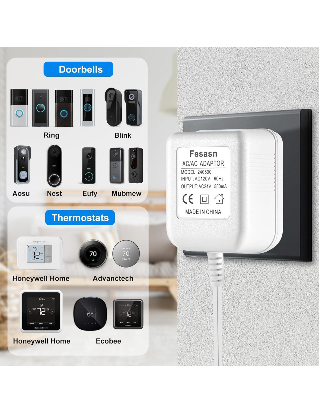 Fesasn tiene un equipo de profesionales que se ha estado enfocando en el diseño y fabricación de transformadores durante muchos años, mejorando constantemente la tecnología para satisfacer las necesidades de los consumidores. Nuestro equipo ha desarrollado un nuevo diseño mejorado que resuelve completamente el problema del ruido y el calor generado durante el uso, y la salida estable de 24V CA hace que su timbre visual funcione perfectamente. Con este adaptador de timbre, puede cargar el timbre continuamente sin preocuparse por la interrupción del funcionamiento del producto del timbre, lo que lo convierte en un excelente transformador especial para timbres Ring. No necesita quitar la batería dentro del timbre, solo conecte este transformador y cargue el timbre en cualquier momento, que es lo que queremos que haga por usted. Adaptador de alimentación de 24V compatible con: cables de alimentación de 24V CA de EE. UU. para sus populares termostatos inteligentes (Nest 1/2, Ecobee, Honeywell, Sensi) y timbres (Timbre de video Ring, Timbre de video Ring 2 y Timbre de video Ring Pro, Nest Skybell, etc.) y otros dispositivos que requieren una fuente de alimentación constante de 24 voltios CA, lo que le permite cargar sus dispositivos de forma segura.