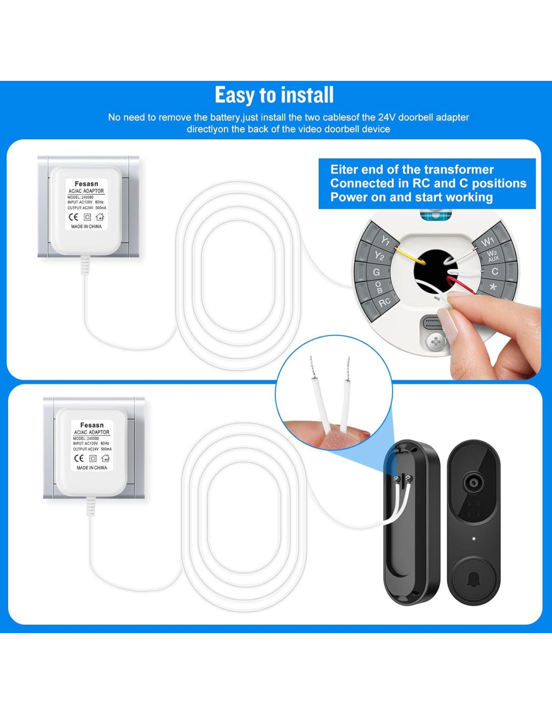 - Método de instalación de la fuente de alimentación del timbre: la instalación es muy simple y conveniente, solo use el adaptador para conectar el timbre inteligente o termostato a la toma de corriente (nota: primero desconecte el cable de alimentación y luego conecte el timbre o termostato, y finalmente enchufe el adaptador a la corriente, no deje que los dos cables estén conectados juntos para evitar un cortocircuito).