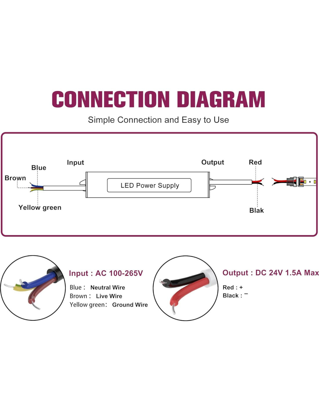 - NOTA: Asegúrese de que su dispositivo funcione a 24V y que la potencia requerida sea inferior a 36W para evitar problemas como no encender, parpadeo, sobrecalentamiento, etc.; Esta fuente de poder no tiene funciones de regulación; Disfrute de la tranquilidad con nuestro servicio postventa de 3 años.