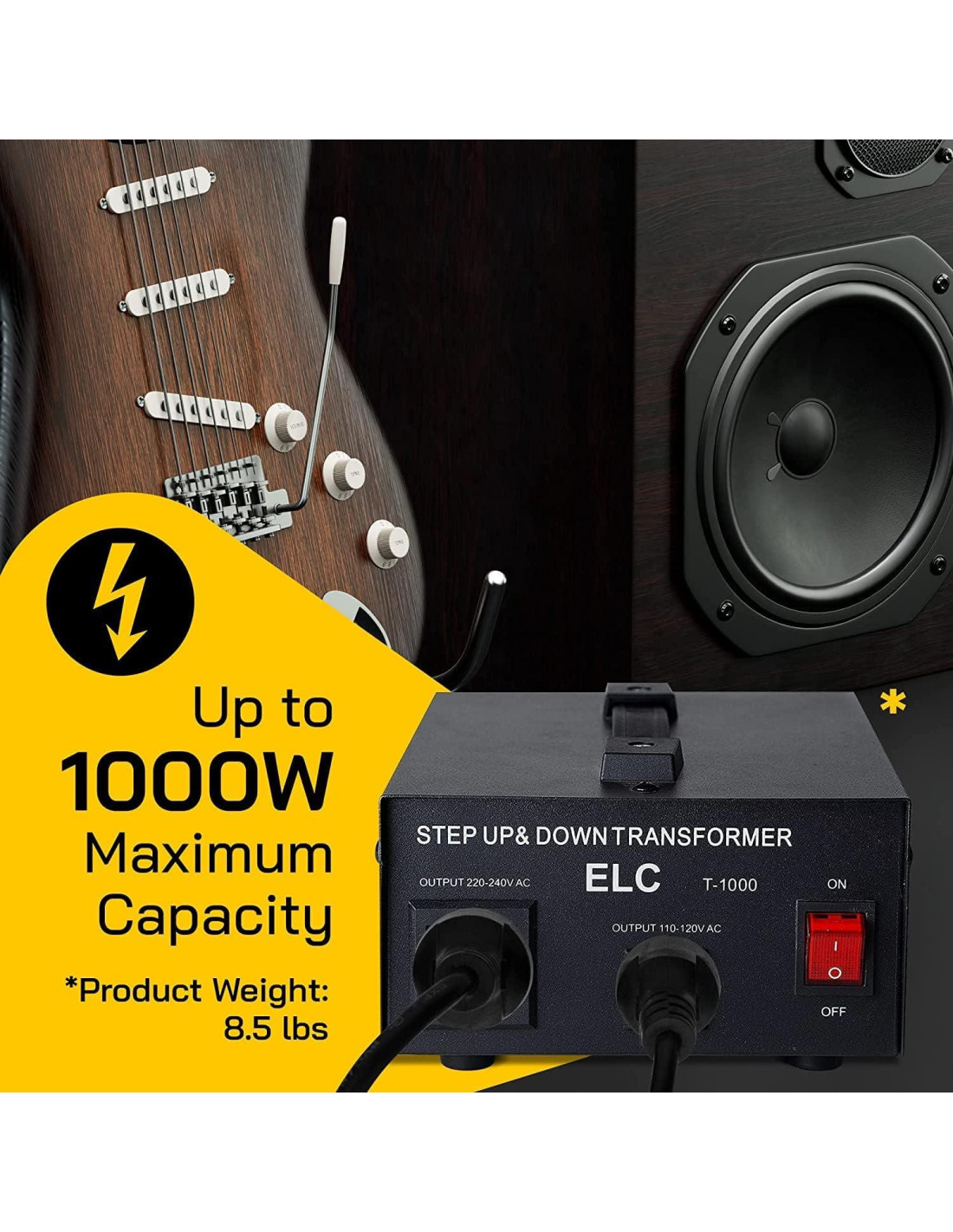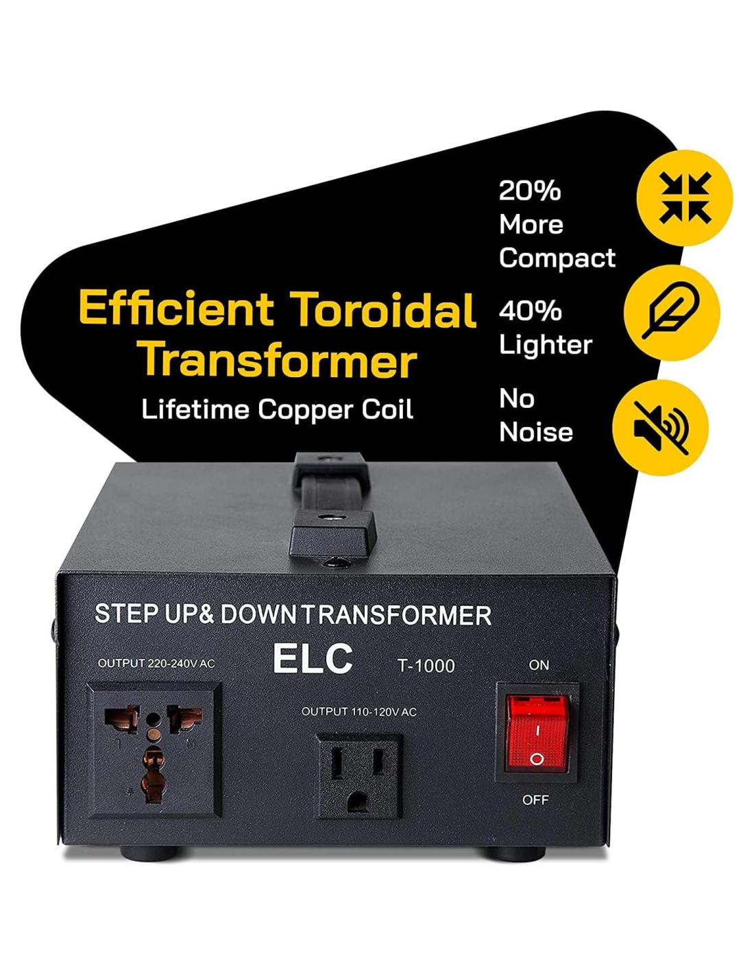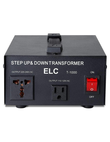Este transformador convertidor de voltaje es altamente eficiente con conversión de aumentar/disminuir. Este dispositivo transformador no hace ruido mientras está en uso, es completamente silencioso y fácil de usar. Nuestro transformador de voltaje es una solución conveniente para convertir voltaje de 220v a 110v (disminuir) o de 110v a 220v (aumentar) para aplicaciones tanto domésticas como industriales. Cuenta con un cable de alta resistencia con un enchufe estándar de 3 clavijas de EE. UU. No recomendamos este producto para artículos que producen calor de alta potencia como cafeteras, máquinas de espresso y equipos de soldadura, etc. Por razones de seguridad, se recomienda usar un Convertidor/Transformador de Voltaje que tenga una potencia máxima al menos 2 veces mayor que la de su aparato. Por ejemplo; este transformador de 1000 Vatios solo se puede usar con un aparato que consuma hasta 450 Vatios para prevenir daños tanto al transformador como al aparato utilizado. ELC ofrece una amplia variedad de equipos electrónicos que permiten operar dispositivos de alta gama como consolas de videojuegos, secadores de pelo, planchas para el cabello y muchos otros tipos de dispositivos. Este producto le permitirá operar aparatos de EE. UU./Canadá que están diseñados para funcionar con 110/120v. Dado que la conversión de voltaje es 220/240v en otros lugares, nuestros accesorios le ayudan a operar dispositivos con eficiencia. No funcionará con 220 americano (Fase Doble, No diseñado para 220V de EE. UU.) Este equipo tiene 1 x Enchufe de 110V, 1 x Enchufe Universal de 220V.
