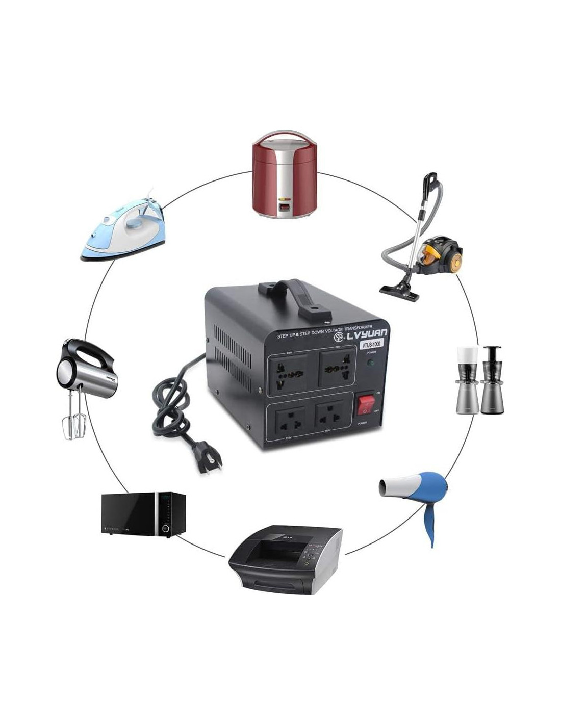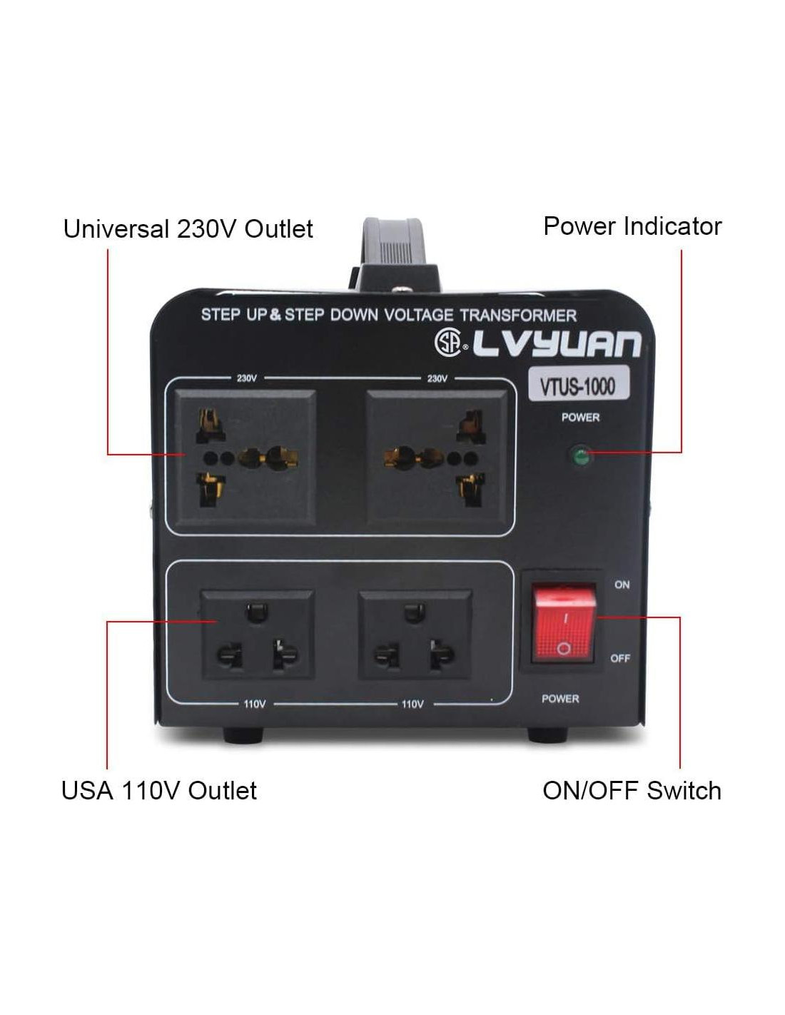 - Lo Que Obtienes: Un Transformador de Voltaje de 1000 Vatios con Enchufe Estándar de EE. UU., Un Manual, Garantía Limitada del Fabricante de 1 Año.