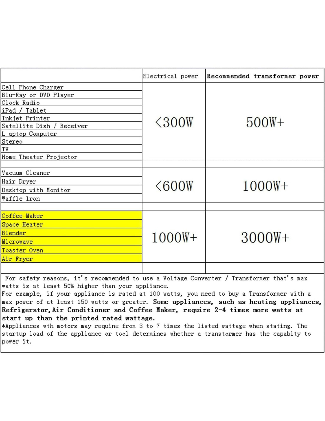 El Convertidor Transformador de Voltaje Paso Arriba/Abajo de Cantonape ofrece una solución segura, confiable, rentable y fácil. No necesitas seleccionar manualmente el voltaje de entrada (por el selector) y preocuparte por configurar el transformador incorrectamente, lo que dañaría el transformador mismo y el dispositivo conectado. Paso Arriba y Paso Abajo Automático (110/120V <> 220/240V) con un rendimiento super silencioso. Para un Uso Óptimo: 1. Por razones de seguridad, se recomienda usar un Convertidor/Transformador de Voltaje cuya potencia máxima sea al menos un 50% mayor que la de tu aparato. 2. Por ejemplo, si tu aparato tiene una potencia nominal de 100 vatios, necesitas comprar un Transformador con una potencia máxima de al menos 150 vatios o más. Algunos aparatos, como los aparatos de calefacción, herramientas eléctricas, motores, impresoras láser y televisores, requieren de 2 a 4 veces más vatios al inicio que la potencia nominal impresa. 3. Por favor, cambia al voltaje correcto antes de encender el transformador (110V en EE. UU.). 4. Recomendamos un factor de eficiencia de 3X para artículos de alta potencia que producen calor, como Aire Acondicionado, Equipos de Soldadura, Microondas y Cafeteras, etc.