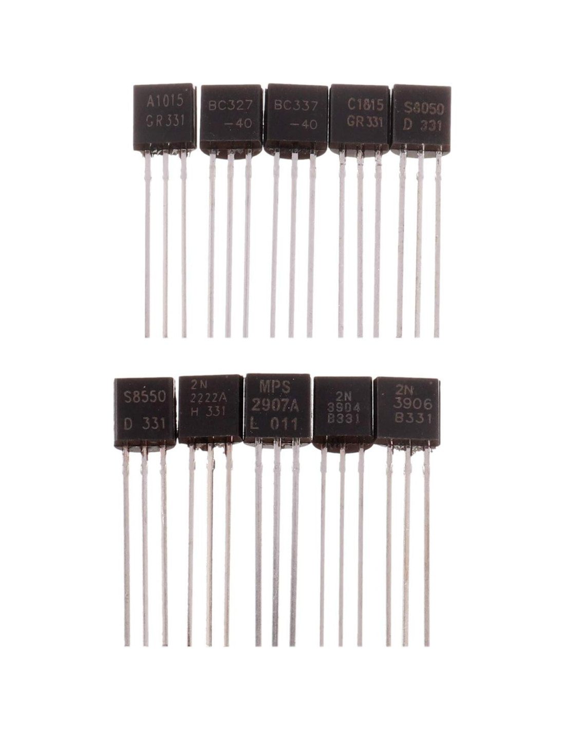 - Modelo de Transistor: 10 Valores, Incluye: A1015 PNP, BC327 PNP, BC337 NPN, C1815 NPN, S8050 NPN, S8550 PNP, 2N2222 NPN, 2N2907 PNP, 2N3904 NPN, 2N3906 PNP.