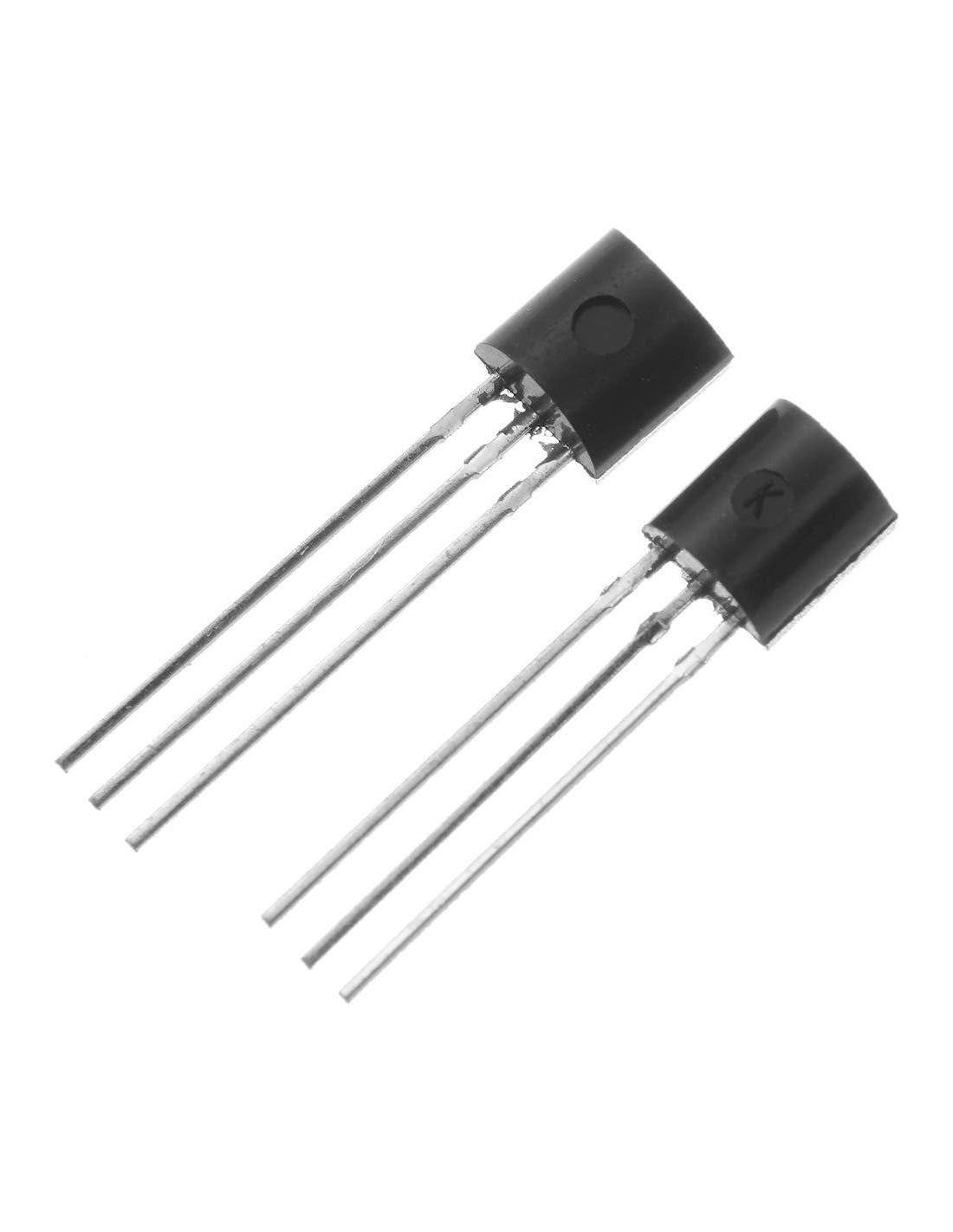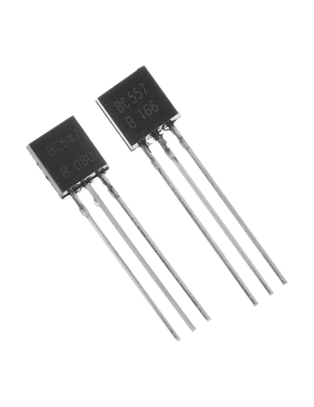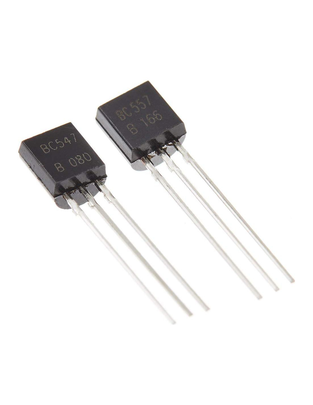 El BC547 es un Transistor NPN(BC557, PNP), adecuado para su uso en etapas de driver y salida de amplificadores de audio, etapas de entrada de bajo ruido de grabadoras de cinta, amplificadores Hi-Fi y circuitos de procesamiento de señales de receptores de televisión. Voltaje Colector Emisor V(br)ceo: 45V DC Corriente Colectora: 100mA DC Ganancia de Corriente hFE: 200hFE Estilo de Caja del Transistor: TO-92 Temperatura de Operación Máx: 150C Paquete incluye: 50pcs*BC547 50pcs*BC557
