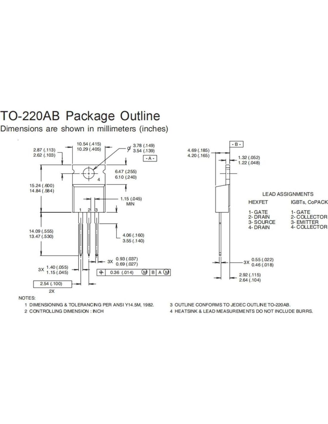 La resistencia en estado de conducción por área de silicio del transistor IRFZ46N es extremadamente baja. Este beneficio combina una rápida velocidad de conmutación con robustez. El paquete TO-220 es universalmente preferido para todas las aplicaciones comerciales e industriales a niveles de disipación de potencia de aproximadamente 50 vatios. La baja resistencia térmica y el bajo costo del paquete TO-220 contribuyen a su amplia aceptación en toda la industria. Corriente de drenaje continua máxima: 53 A Corriente de drenaje fuente máxima: 55 V Resistencia de drenaje fuente máxima: 17 m Disipación de potencia máxima: 107 W Temperatura mínima de operación: -55 C Temperatura máxima de operación: +175 C El paquete incluye: 10pcs * IRFZ46N