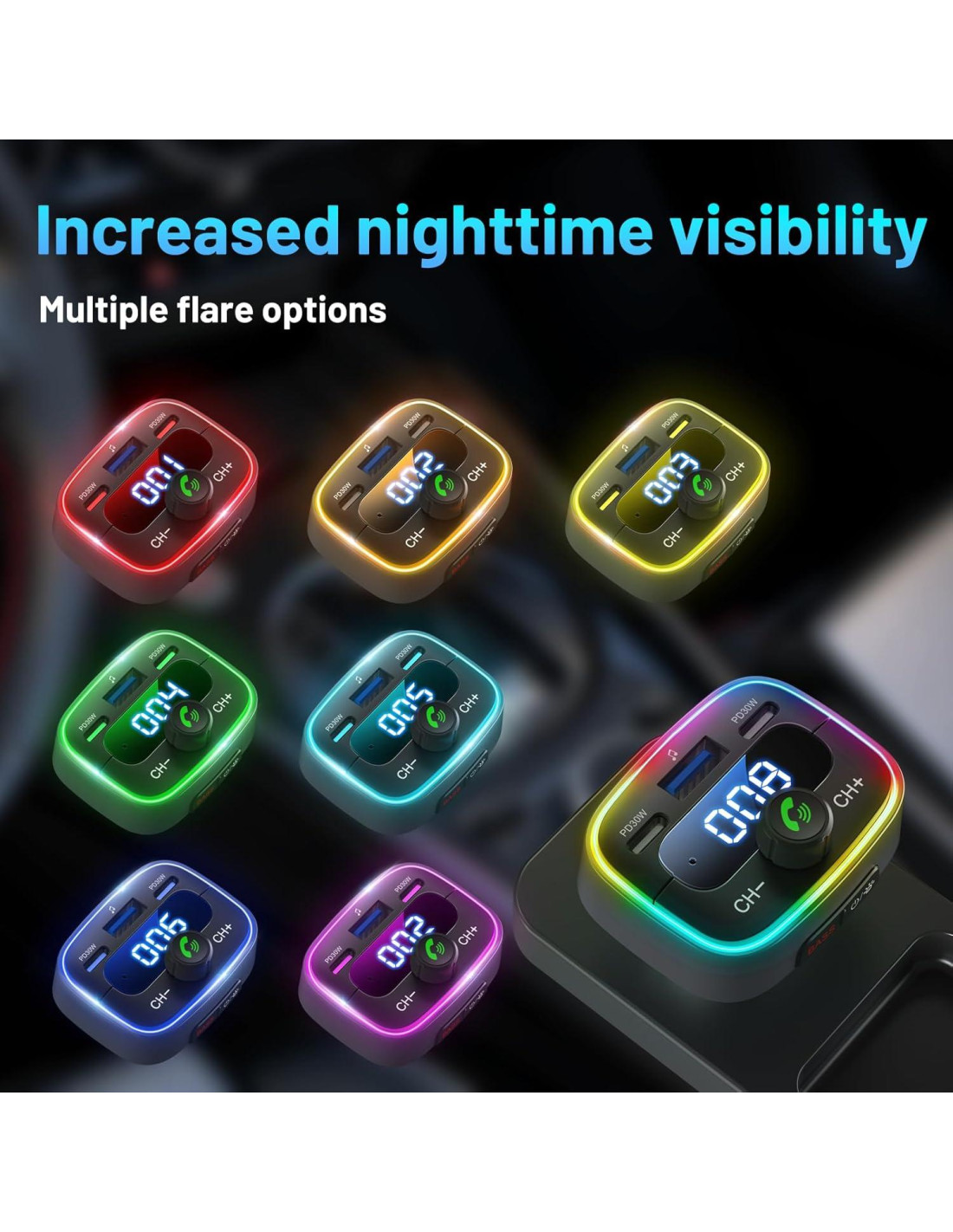 - Mejorada Visibilidad Nocturna: El transmisor fm bluetooth para coche viene con 7 colores de luz ambiental incorporados que se pueden cambiar fácilmente con un botón. No solo mejora la visibilidad dentro del coche por la noche, sino que también crea una atmósfera elegante y de alta tecnología para una experiencia de conducción más estilizada.