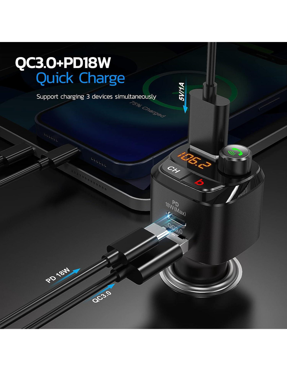 - Carga rápida y 3 puertos USB: El adaptador de coche Bluetooth NX12 cuenta con dos puertos de carga rápida (PD18W y QC3.0) y un puerto USB convencional. Los puertos USB PD 18W y QC 3.0 ofrecen velocidades de carga 4 veces más rápidas que las conexiones de carga estándar. Con tres conexiones USB, no tendrás que preocuparte por cargadores insuficientes o carga lenta para varios dispositivos.
