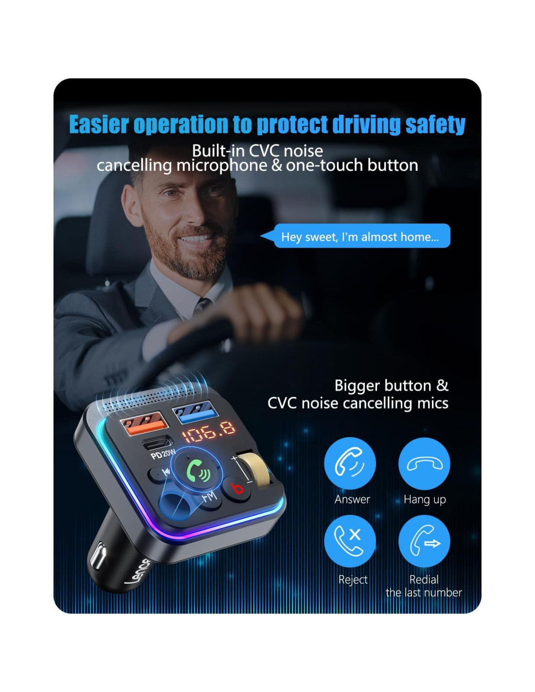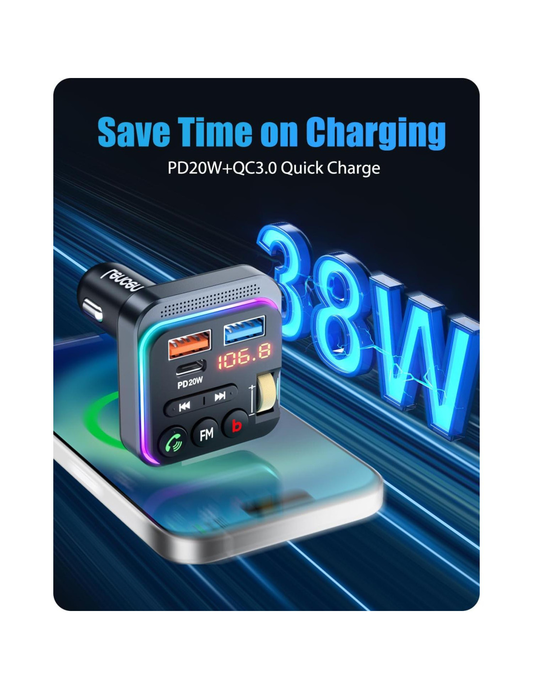 - [Carga Rápida PD 20W & QC 3.0] El Transmisor FM Bluetooth LENCENT está equipado con puerto de carga PD 18W Tipo-C y USB QC3.0, cargando rápidamente dos dispositivos al mismo tiempo. Soporta carga super rápida de Samsung y carga rápida de ipad pro/iphone/Google/Moto/LG/dispositivos Android. LENCENT puede proporcionarte una experiencia de carga rápida y conveniente.