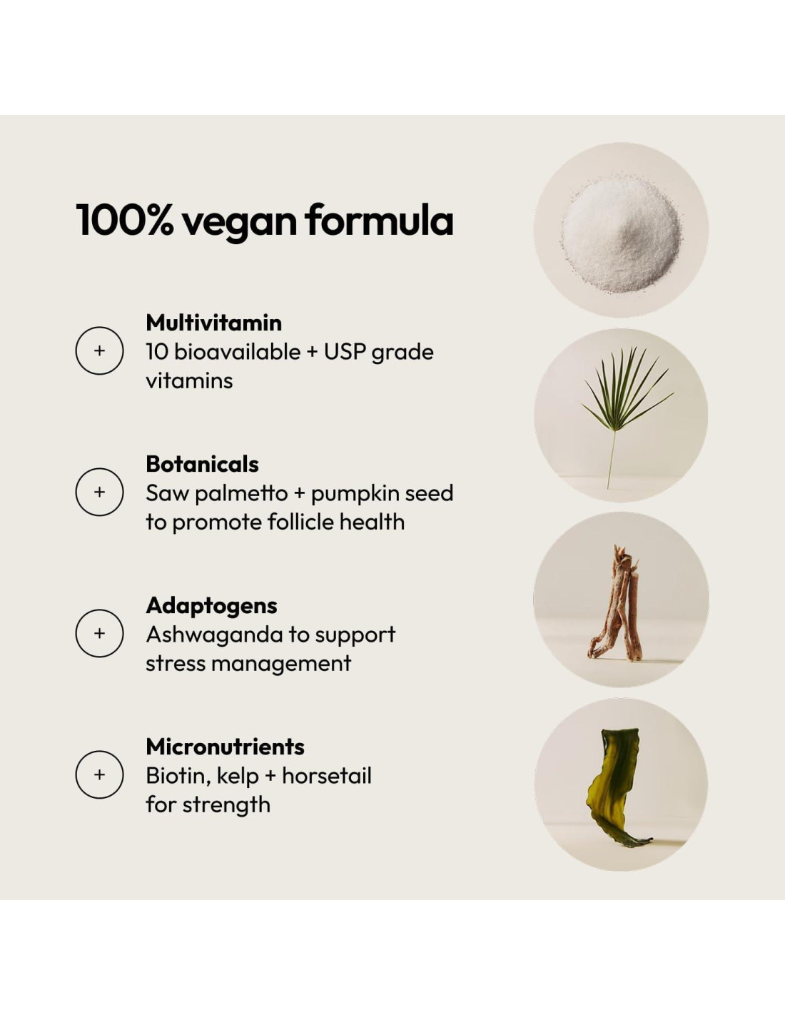 - Mezcla de Fuerza Clínica - Adaptógenos como el Ashwagandha ayudan a equilibrar las hormonas del estrés que contribuyen al adelgazamiento y la pérdida de cabello. Botánicos como el Saw Palmetto apoyan un cabello saludable y promueven el grosor, y los micronutrientes promueven la fuerza y la textura del cabello.