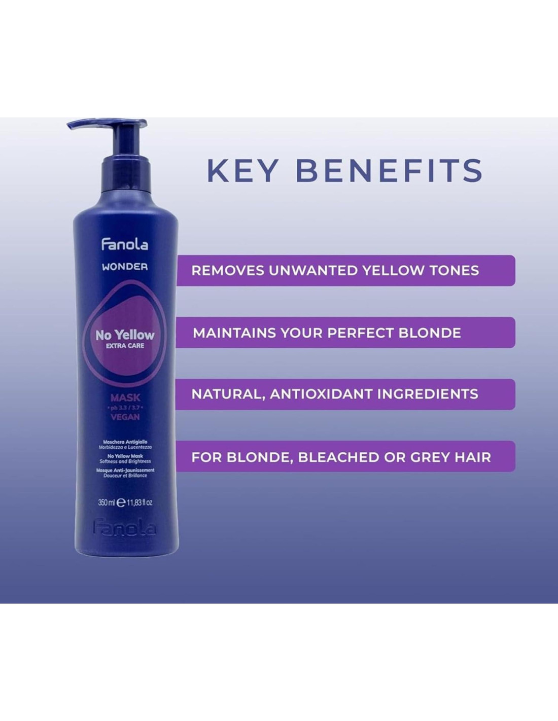 - Di Adiós a los Tonos Amarillos - Este tratamiento capilar hidratante Fanola No Yellow está formulado con un Pigmento Violeta Extra. El rico tono neutraliza instantáneamente los tonos amarillos y anaranjados, convirtiéndolo en el cuidado capilar perfecto para mujeres y hombres con cabello rubio, decolorado, superaclarado y gris.