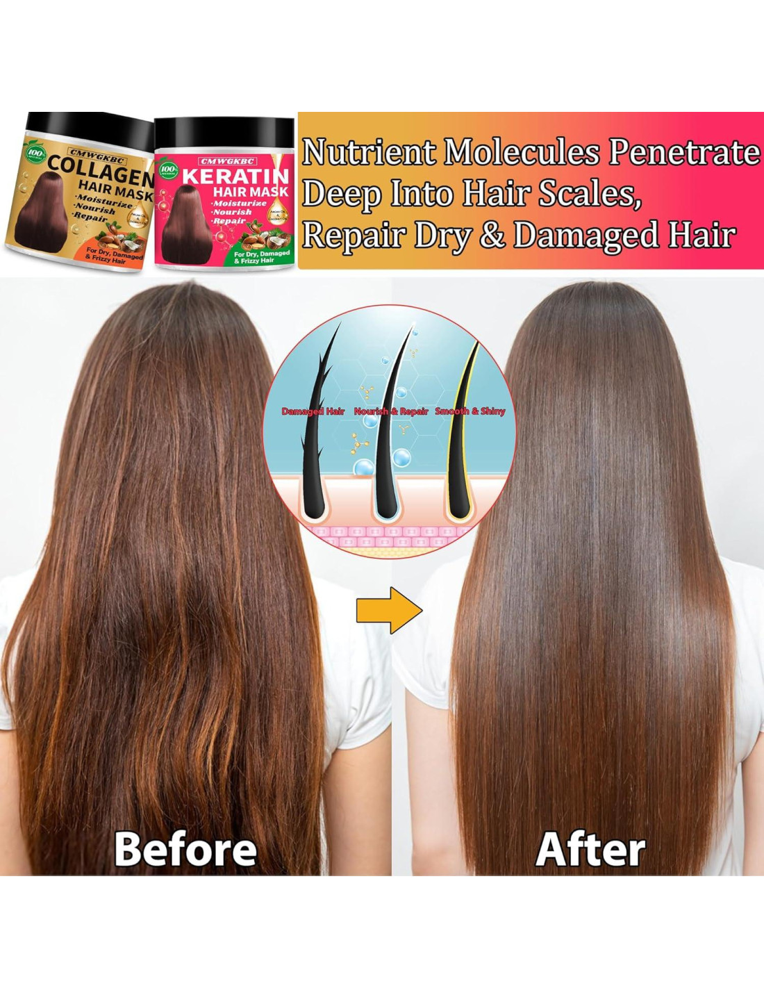 - Mascarilla de Queratina para Cabello Seco y Dañado: La Queratina puede proteger el cabello de factores externos y regular la humedad del cabello manteniendo un equilibrio de humedad, haciendo que el cabello sea más suave e hidratado, reduce el cabello seco y las puntas abiertas, la Queratina también ayuda a reducir el encrespamiento y la fricción, haciendo que el cabello luzca más suave, brillante y más fácil de peinar