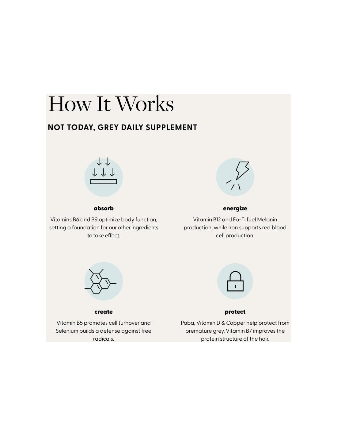 - RETARDA EL CABELLO GRIS EN 3-6 MESES: No Hoy, Gris ayuda con la repigmentación del cabello, entregando una poderosa mezcla de vitaminas, minerales y antioxidantes para frenar la progresión del cabello gris.
