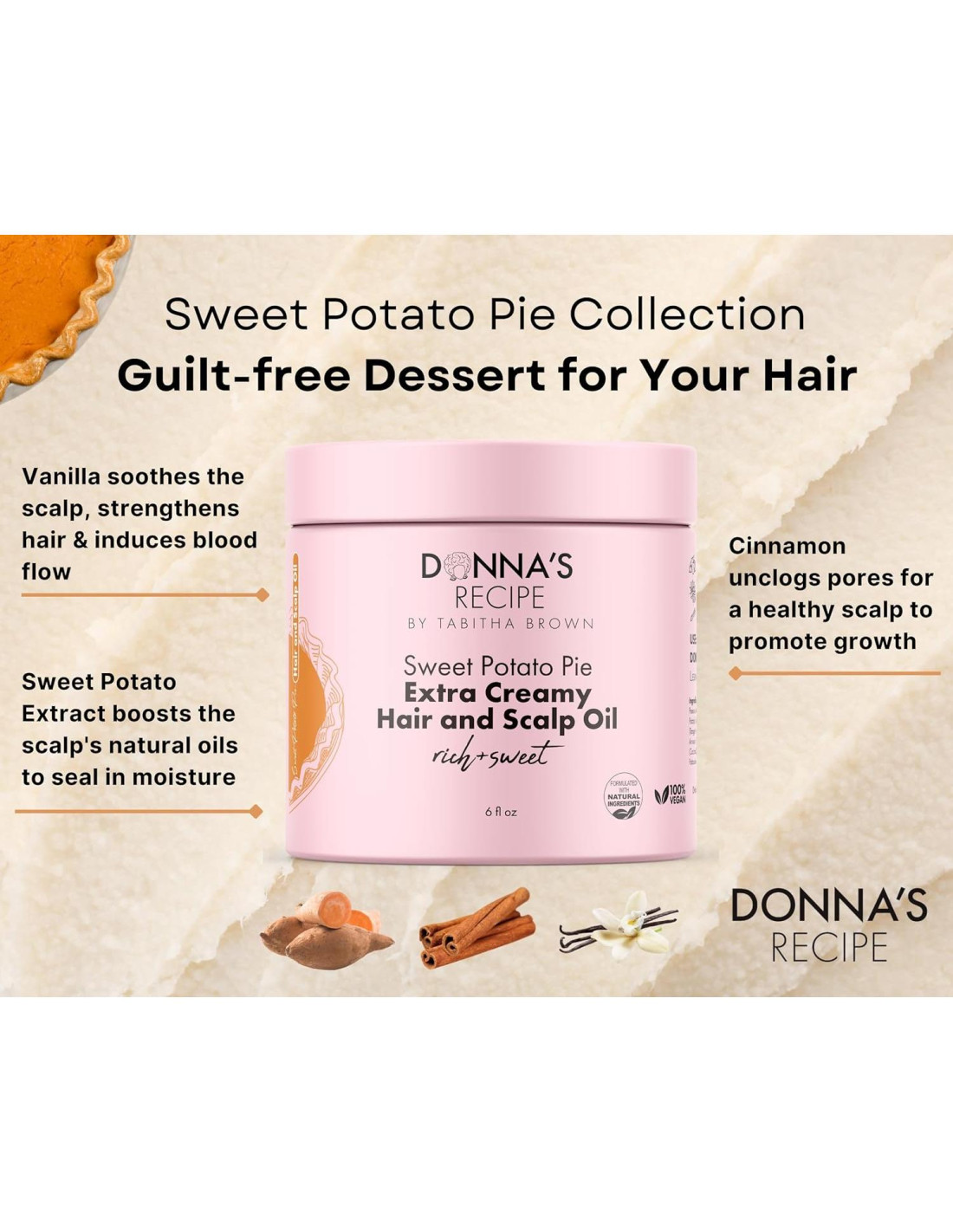 - El extracto de batata potencia los aceites naturales del cuero cabelludo para sellar la humedad
