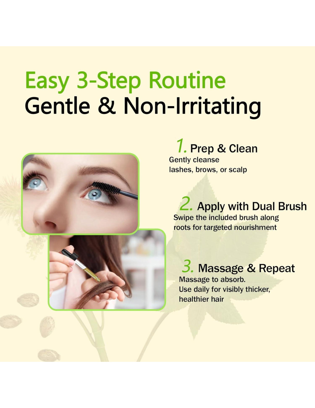 - Promueve Cabello, Pestañas y Cejas Más Gruesas - Enriquecido con ácido ricinoleico y ácidos grasos omega para nutrir los folículos, mejorar la densidad y apoyar un cabello y pestañas de apariencia más larga y llena.