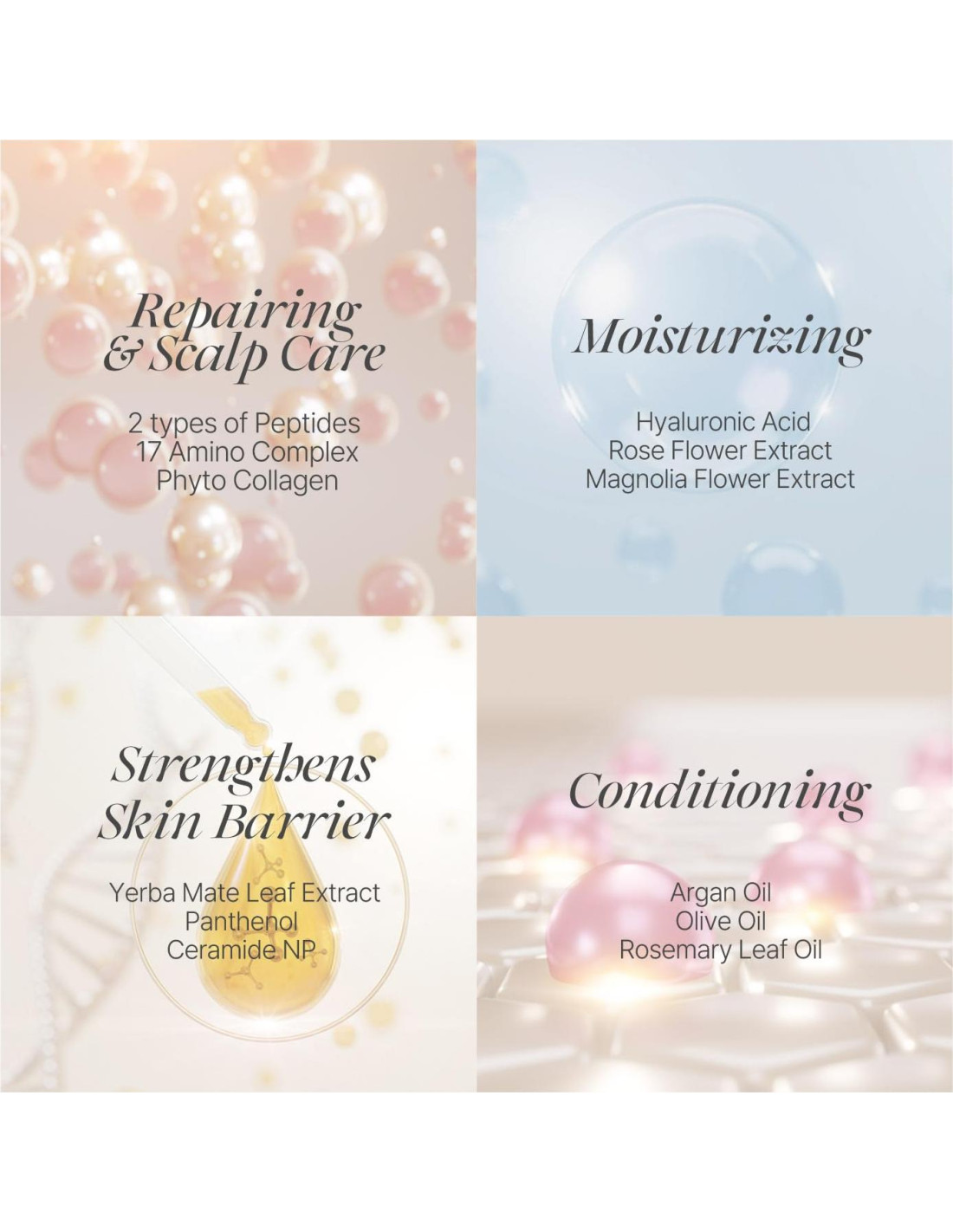 - Fortalece la Barrera de la Piel: Contiene ingredientes nutritivos como Ceramida, Pantenol y Extracto de Hoja de Mate, ayuda a formar una barrera hidratante. Además, enriquecida con Aceite de Argán, Aceite de Oliva y Aceite de Hoja de Romero para calmar y acondicionar profundamente todo el cabello y cuero cabelludo.