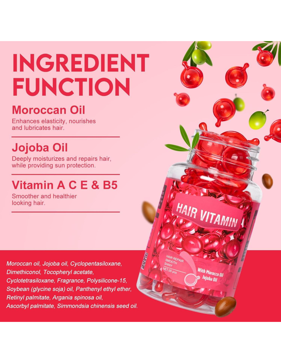 - Seguridad: Este producto de cápsulas de vitaminas para el cuidado del cabello está hecho con ingredientes seguros, cápsulas de vitaminas para el cabello con Aceite de Marruecos y aceite de Jojoba, aceite de Aloe vera, Vitaminas A, C, E y B5, proporciona al cabello un cuidado intensivo, nutrición y protección para el cabello dañado químicamente.