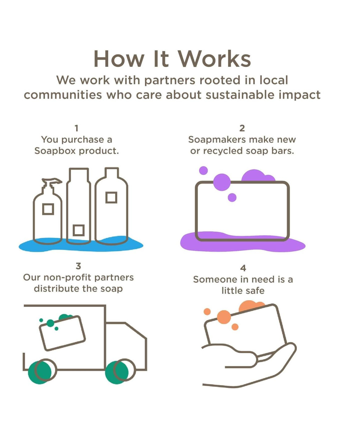Una barra donada con cada compra de producto. Productos para el cabello y el cuerpo ultra hidratantes que devuelven. Libre de crueldad. Devolver debería ser fácil. Por eso, cada compra con Soapbox es una donación de una barra de jabón que mantiene a alguien en necesidad un poco más seguro. Trabajamos con socios arraigados en comunidades locales que se preocupan por el impacto sostenible. Cada producto tiene un código HOPE único para rastrear cómo tu compra devuelve.