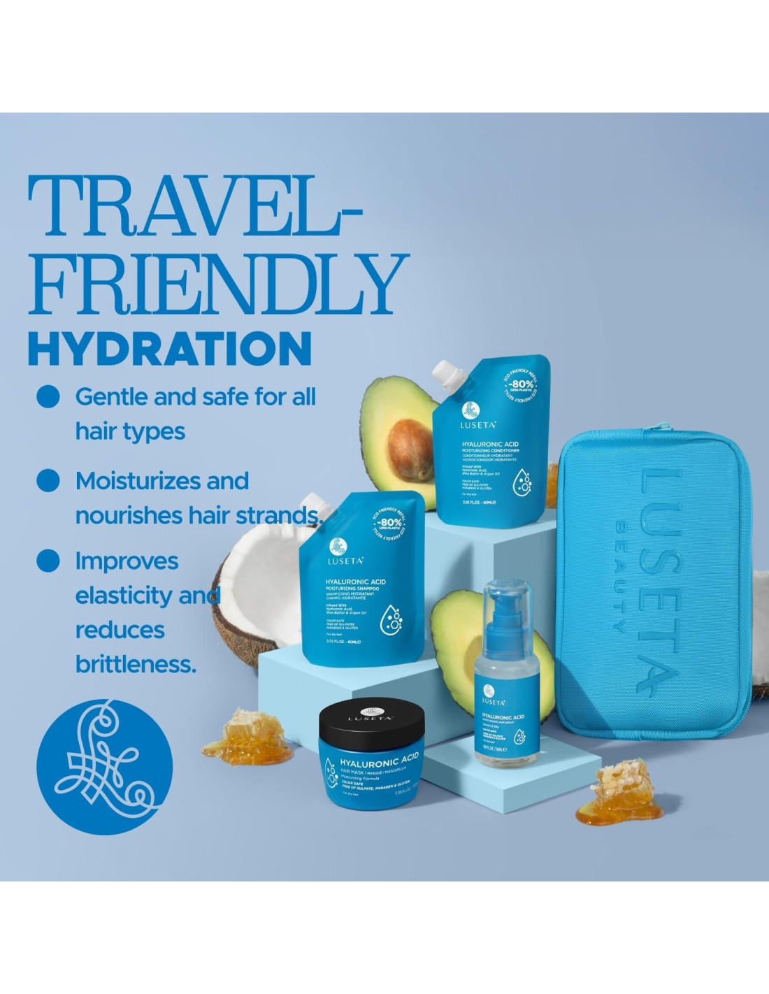- Este Kit de Viaje Luseta incluye un Set de Viaje de 4 piezas con Ácido Hialurónico, que también son tamaños amigables con TSA para llevar en el avión. Incluye champú, acondicionador, mascarilla capilar y suero capilar.