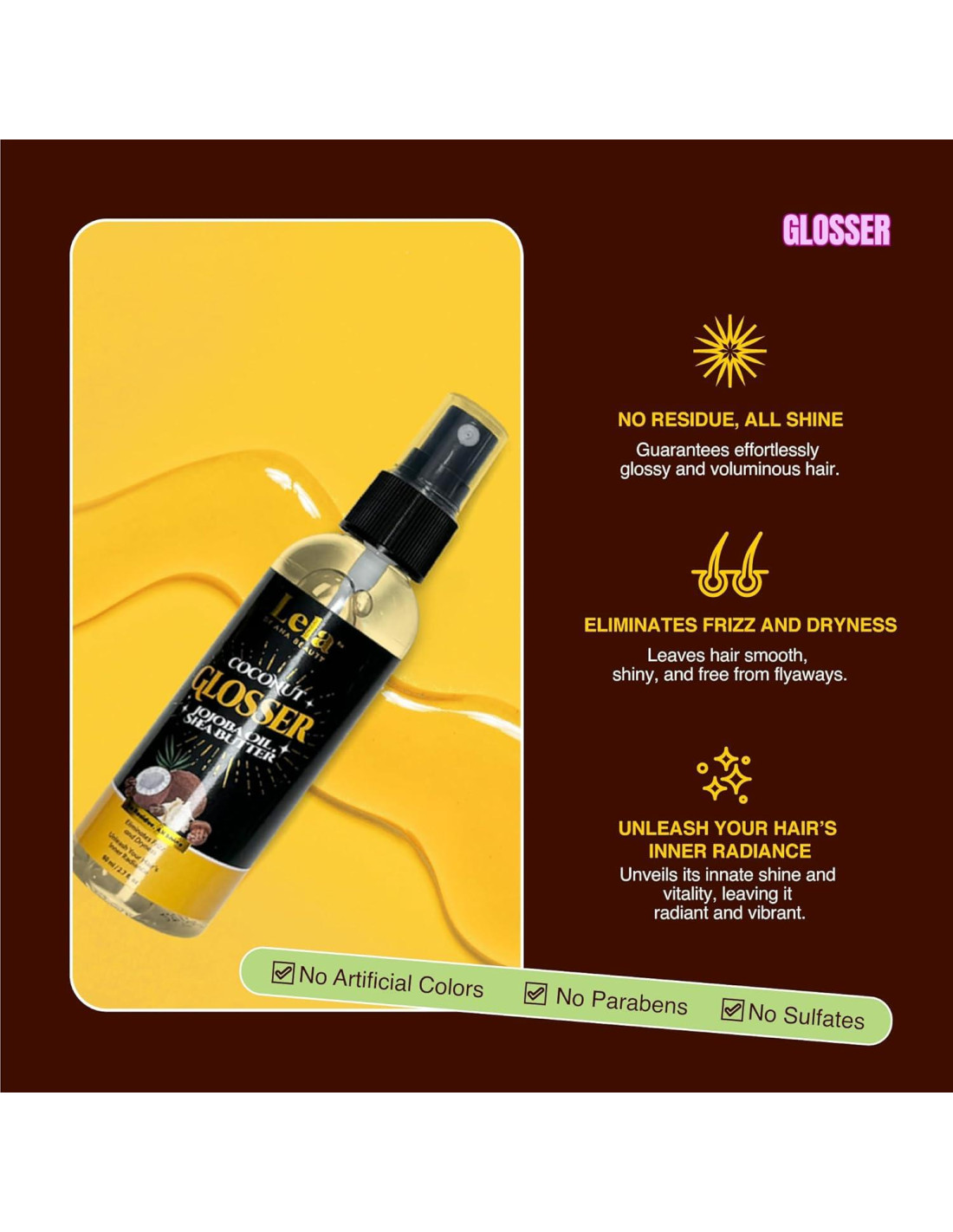 Presentamos el Conjunto de Cuidado del Cabello Amigable para Viajes de Lela, meticulosamente curado para satisfacer todas tus necesidades capilares en movimiento. Este conjunto integral incluye tres sprays esenciales: un Acondicionador Sin Enjuague, un Spray de Acabado de Fuerte Sostenimiento y un Glosador, cada uno infusionado con aceites naturales nutritivos y formulado para encajar perfectamente en tu rutina de viaje. 1. El Glosador añade el toque final a tu peinado listo para viajar, infundiendo tus mechones con un brillo y vitalidad inigualables. Formulado con aceites de Coco y Jojoba, Vitamina E y Manteca de Karité, este spray proporciona un brillo luminoso mientras protege tu cabello de las exigencias del viaje. Ya sea que estés viajando a destinos exóticos o emprendiendo una escapada de fin de semana, nuestro spray Glosador asegura que tu cabello luzca y se sienta lo mejor posible. 2. El Spray de Acabado de Fuerte Sostenimiento asegura que tu peinado se mantenga intacto a lo largo de tus aventuras. Elaborado con una mezcla única de ingredientes, este spray ofrece un sostenimiento inigualable y añade un brillo radiante a tu cabello, asegurando que tu estilo se mantenga en su lugar sin importar qué. Perfecto para asegurar tus looks favoritos desde la mañana hasta la noche, este spray de acabado ofrece un rendimiento duradero sin pesadez ni rigidez, permitiéndote explorar con confianza. 3. El Acondicionador Sin Enjuague Terminador de Enredos proporciona mechones suaves y sin enredos mientras estás en movimiento. Enriquecido con una mezcla de Aceite de Aguacate y Vitamina E, este spray ligero desenreda e hidrata tu cabello sin esfuerzo, dejándolo lujosamente suave y manejable dondequiera que tus viajes te lleven. Di adiós a los nudos y hola a mechones sedosos con esta adición esencial a tu arsenal de cuidado capilar para viajes.