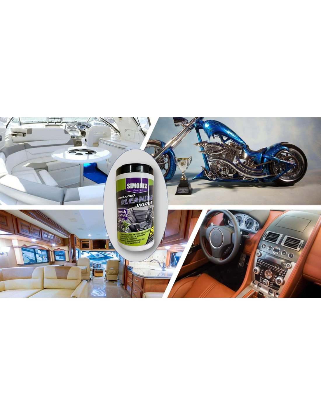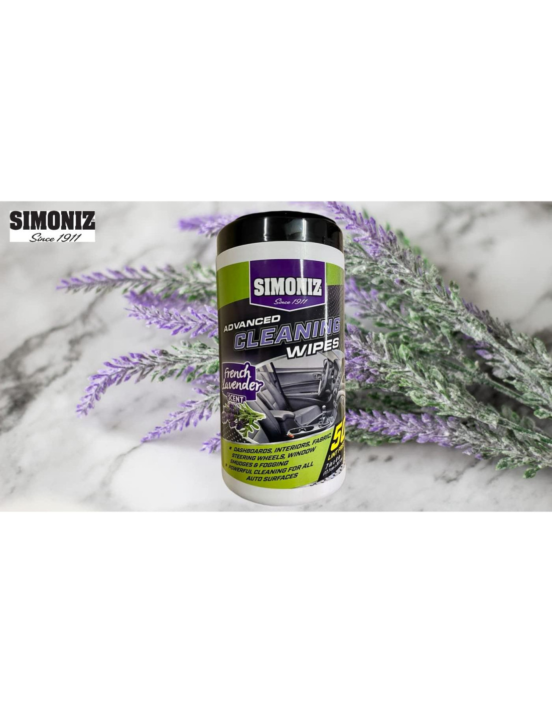 Toallitas de limpieza avanzadas Simoniz con aroma a lavanda francesa - Protectores interiores o la mayoría de las superficies - Plástico, Caucho, Vinilo, Tableros, Asientos, Puertas y Neumáticos - Genial para Autos, Camiones, SUV, Barcos 50 Contenido Obtén ese aspecto y sensación de auto nuevo y brillo de sala de exhibición con estas toallitas de limpieza premium utilizadas por detallistas profesionales, concesionarios y propietarios de automóviles por igual. Este producto conveniente no solo limpia todas las superficies interiores, sino que también protege y brilla. La fórmula no grasosa es excelente para cualquier superficie... incluyendo las ventanas, tapicería, tablero, pantallas tecnológicas, etc. ¿Qué tan práctico es eso? ¡Uno y listo! Simplemente mantenlo en tu consola o maletero para una fácil limpieza de derrames o una rápida limpieza interior cuando tengas pasajeros de último minuto. Con las toallitas de limpieza interior Simoniz, obtienes las mejores toallitas de detallado de automóviles de la marca de cuidado automotriz más antigua y confiable en los Estados Unidos durante más de 100 años.