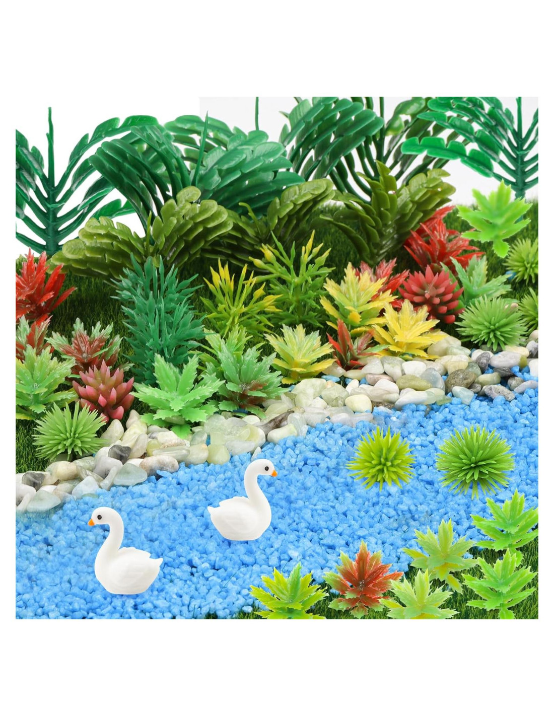 - El paquete incluye: 50g de piedras blancas, 100g de piedra mixta, 50g de piedra de arena azul y 79 piezas de Plantas Modelo Árboles Miniatura de 0.6-2.7 pulgadas (14 estilos). Este Material de Base Miniatura es bueno para Artesanías DIY, modelo de jardín miniatura.