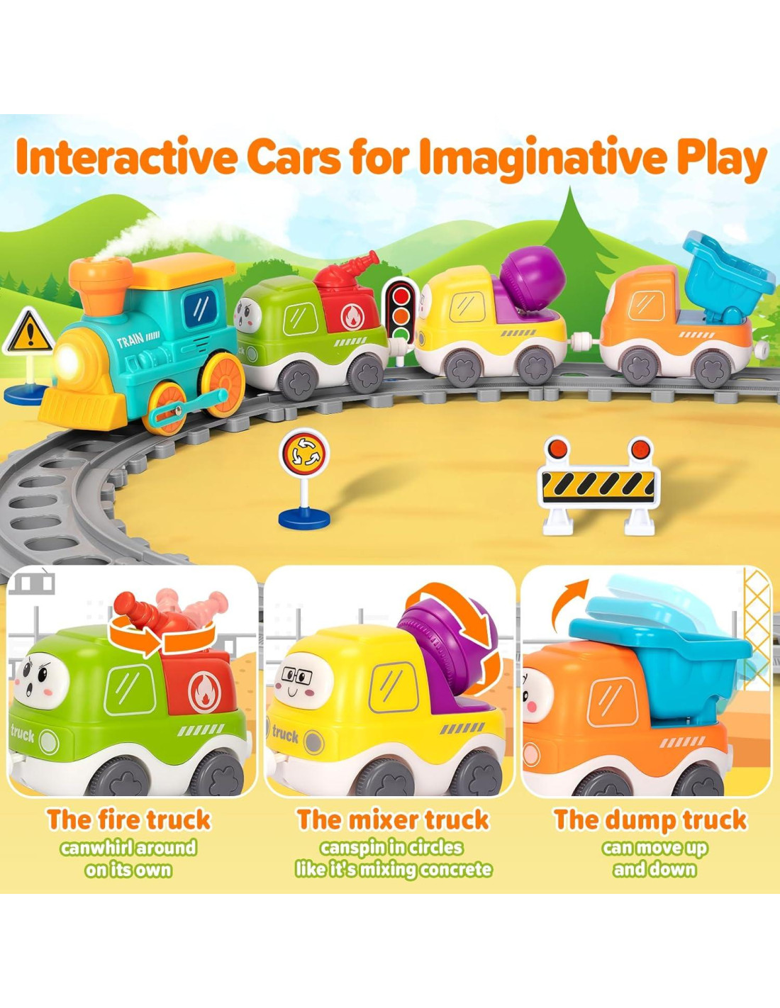 Este juego de tren eléctrico para niños pequeños viene con una locomotora a batería, 3 camiones de construcción, 8 vías curvas, 2 vías rectas, 6 señales de tráfico y un inyector de agua. Los niños pueden construir fácilmente diferentes diseños, agregar agua para activar el vapor y disfrutar de luces y sonidos alegres para una aventura ferroviaria realista. Las conexiones magnéticas permiten que los camiones se unan y se separen suavemente, fomentando el juego creativo y la resolución de problemas. El diseño duradero y seguro para niños con bordes suaves garantiza un entorno de juego seguro, mientras que la locomotora puede funcionar tanto en las vías como fuera de ellas para mayor diversión. Perfecto para cumpleaños, vacaciones o decoraciones navideñas, este juego de tren con temática de construcción ofrece horas interminables de juego imaginativo y es un regalo maravilloso para niños y niñas.