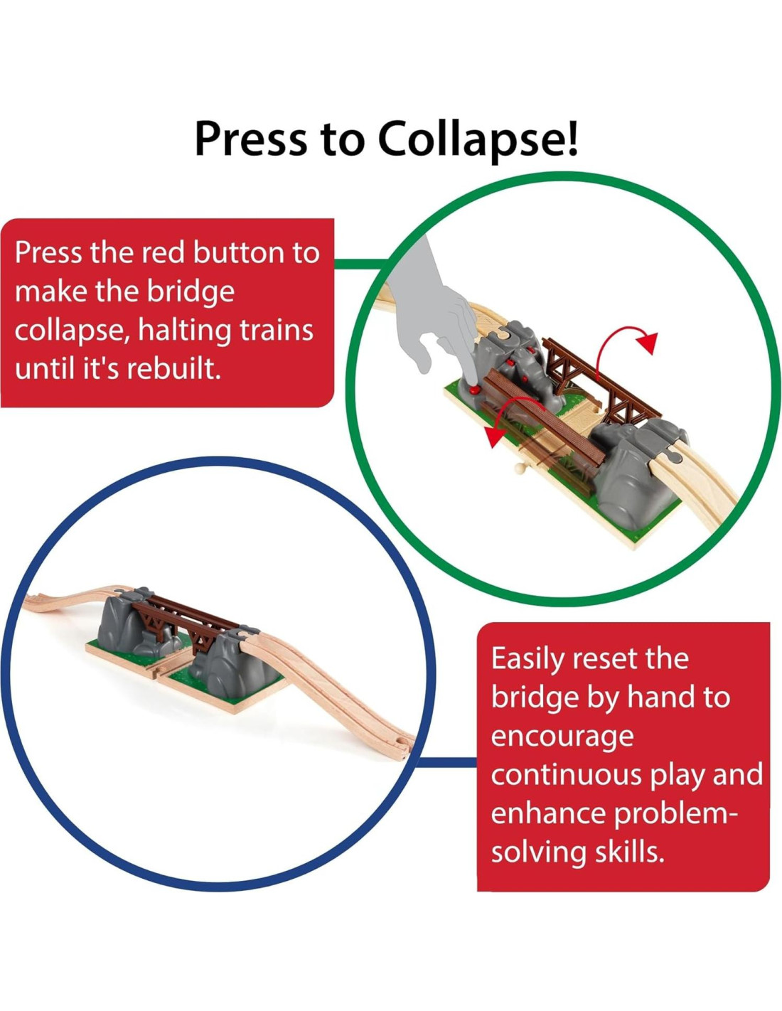 - Desbloquea el Poder de la Imaginación: El Puente Colapsable para juegos de vías de tren de madera fomenta la creatividad y enciende la imaginación con posibilidades ilimitadas. Agrega este emocionante puente interactivo a conjuntos existentes para hacer crecer el imperio ferroviario de su hijo.