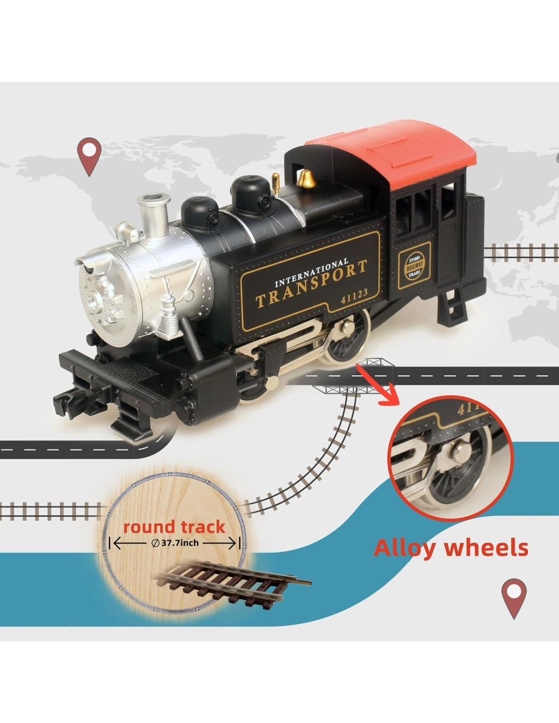 - Conjuntos de trenes: 1pc locomotora, 2pcs vagones, 1pc controlador, 1pc transformador, 1pc cable de conexión, 1pc pista recta, 1pc riel de clip de energía, 11pcs pistas curvas, impulsado por locomotora de modelo a vapor