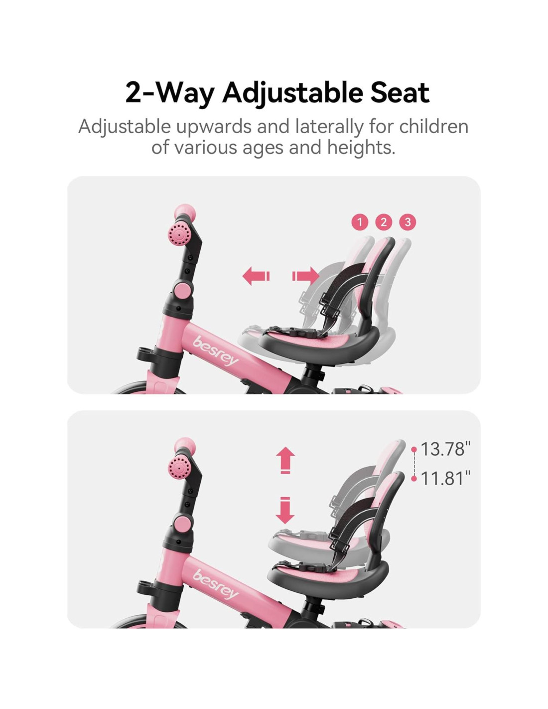 5 ángulos ajustables (45 hacia adelante/hacia atrás) proporcionan comodidad óptima durante cada paseo. Permite que este triciclo crezca con su niño desde 1 hasta 3 años. Permite opciones de asiento personalizables y mayor comodidad. ¡Disfruta cambiando sin esfuerzo entre múltiples modos con solo presionar un botón! Manija controlada por el padre para guiar y enseñar a los niños mientras aprenden a dirigir. Proporciona apoyo y movilidad para los primeros pasos de su pequeño. Primer triciclo para sus hijos que inspira confianza y alegría en los paseos iniciales. Desarrolla equilibrio, dirección y coordinación mientras aumenta la autoconfianza. Consulte el manual adjunto, puede ensamblarlo fácilmente en unos minutos. Diseñado para ser portátil y compacto, es el compañero perfecto para disfrutar al aire libre. Se pliega sin esfuerzo en una forma más compacta para guardarlo fácilmente en el maletero o en la habitación sin ocupar demasiado espacio. BR-KSE06 BR-C727 BR-C718 BR-KSE01 BR-KSE02